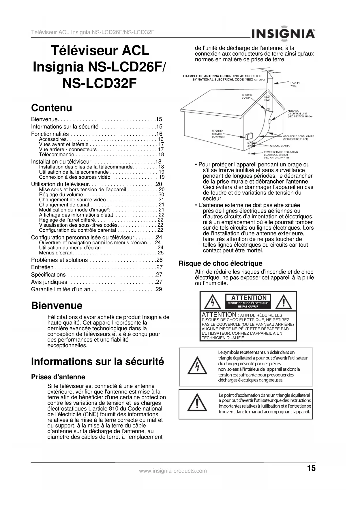 - Garantie limitée d’un an Bienvenue Félicitations d’avoir acheté ce produit Insignia de haute qualité. Cet appareil représente la dernière avancée technologique dans la conception de téléviseurs et a été conçu pour des performances et une fiabilité exceptionnelles. Informations sur la sécurité Prises d'antenne Si le téléviseur est connecté à une antenne extérieure, vérifier que l'antenne est mise à la terre afin de bénéficier d'une certaine protection contre les variations de tension et les charges électrostatiques L'article 810 du Code national de l’électricité (CNE) fournit des informations relatives à la mise à la terre correcte du mât et du support, à la mise à la terre du câble d’antenne sur la décharge de l’antenne, au diamètre des câbles de terre, à l’emplacement de l’unité de décharge de l’antenne, à la connexion aux conducteurs de terre ainsi qu'aux normes en matière de prise de terre.• Pour protéger l’appareil pendant un orage ou s’il se trouve inutilisé et sans surveillance pendant de longues périodes, le débrancher de la prise murale et débrancher l'antenne. Ceci évitera d’endommager l'appareil en cas de foudre et de variations de tension du secteur.• L’antenne externe ne doit pas être située près de lignes électriques aériennes ou d’autres circuits d’alimentation et électriques, ni à un emplacement où elle pourrait tomber sur de tels circuits ou lignes électriques. Lors de l'installation d'une antenne extérieure, faire très attention de ne pas toucher de telles lignes électriques ou circuits car tout contact peut être mortel. Risque de choc électrique Afin de réduire les risques d’incendie et de choc électrique, ne pas exposer cet appareil à la pluie ou l’humidité.EXAMPLE OF ANTENNA GROUNDING AS SPECIFIED BY NATIONAL ELECTRICAL CODE (NEC) ANTENNALEAD-IN WIRE ANTENNADISCHARGE UNIT(NEC SECTION 810-20)GROUNDING CONDUCTORS(NEC SECTION 810-21)GROUND CLAMPSPOWER SERVICE GROUNDINGELECTRODE SYSTEM p. 29
