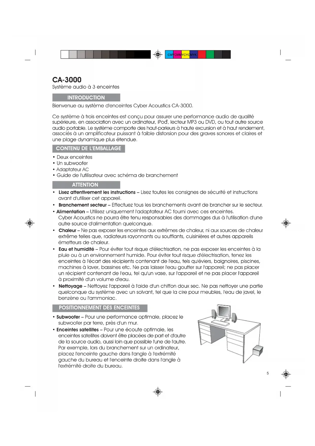 , lecteur MP3 ou DVD, ou tout autre source audio portable. Le système comporte des haut-parleurs à haute excursion et à haut rendement, associés à un amplificateur puissant à faible distorsion pour des graves sonores et claires et une plage dynamique plus étendue. Deux enceintes Un subwoofer Adaptateur AC Guide de l'utilisateur avec schéma de branchement Lisez attentivement les instructions Lisez toutes les consignes de sécurité et instructions avant d'utiliser cet appareil. Branchement secteur Effectuez tous les branchements avant de brancher sur le secteur. Alimentation Utilisez uniquement l'adaptateur AC fourni avec ces enceintes. Cyber Acoustics ne pourra être tenu responsables des dommages dus à l'utilisation d'une autre source d'alimentation quelconque. Chaleur Ne pas exposer les enceintes aux extrêmes de chaleur, ni aux sources de chaleur extrême telles que, radiateurs rayonnants ou soufflants, cuisinières et autres appareils émetteurs de chaleur. Eau et humidité Pour éviter tout risque d'électrisation, ne pas exposer les enceintes à la pluie ou à un environnement humide. Pour éviter tout risque d'électrisation, tenez les enceintes à l'écart des récipients contenant de l'eau, tels qu'éviers, baignoires, piscines, machines à laver, bassines etc. Ne pas laisser l'eau goutter sur l'appareil; ne pas placer un récipient contenant de l'eau, tel qu'un vase, sur l'appareil et ne pas placer l'appareil à proximité d'un volume d'eau. Nettoyage Nettoyez l'appareil à l'aide d'un chiffon doux sec. Ne pas nettoyer une partie quelconque du système avec un solvant, tel que la cire pour meubles, l'eau de javel, le benzène ou l'ammoniac. Subwoofer Pour une performance optimale, placez le subwoofer par terre, près d'un mur. Enceintes satellites Pour une écoute optimale, les enceintes satellites doivent être placées de part et d'autre de la source audio, aussi loin que possible l'une de l'autre. Par exemple, lors du branchement sur un ordinateur, placez l'enceinte gauche dans l'angle à l'extrémité gauche du bureau et l'enceinte droite dans l'angle à l'extrémité droite du bureau. 5C M Y CM MY CY CMY K