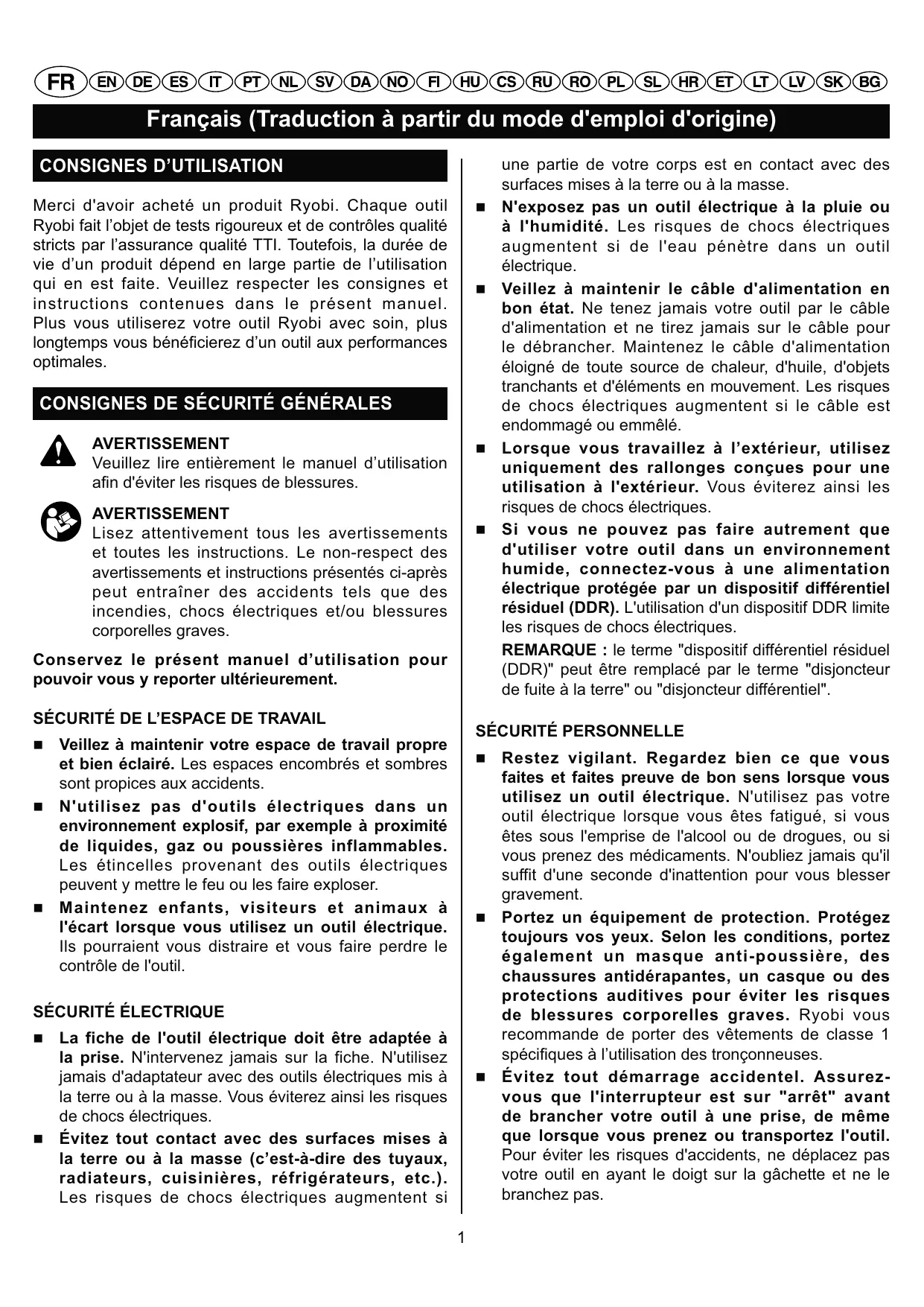 faites et faites preuve de bon sens lorsque vous utilisez un outil électrique. N'utilisez pas votre outil électrique lorsque vous êtes fatigué, si vous êtes sous l'emprise de l'alcool ou de drogues, ou si vous prenez des médicaments. N'oubliez jamais qu'il suffit d'une seconde d'inattention pour vous blesser gravement. Portez un équipement de protection. Protégez toujours vos yeux. Selon les conditions, portez également un masque anti-poussière, des chaussures antidérapantes, un casque ou des protections auditives pour éviter les risques de blessures corporelles graves. Ryobi vous recommande de porter des vêtements de classe 1 spécifiques à l’utilisation des tronçonneuses. £«§¢¥¥¢¬ ¢ £¡® ¤¤¥¯ vous que l'interrupteur est sur "arrêt" avant de brancher votre outil à une prise, de même que lorsque vous prenez ou transportez l'outil. Pour éviter les risques d'accidents, ne déplacez pas votre outil en ayant le doigt sur la gâchette et ne le branchez pas.