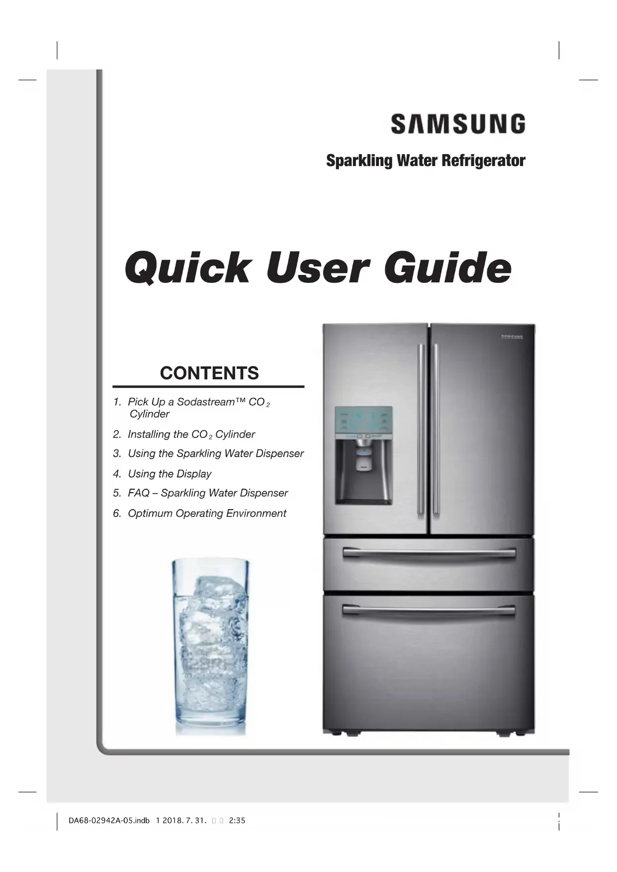 - Si vous n'avez pas l'intention d'utiliser la machine à eau pétillante durant une période prolongée, maintenez appuyé le bouton « Cubed/Crushed » (Glaçon/Glace pilée) durant 3 secondes pour désactiver la machine à eau pétillante. Même si vous arrêtez la machine à eau pétillante, de l'eau pétillante continuera d'être fournie jusqu'à épuisement du contenu du réservoir. (L'arrêt de la machine à eau pétillante entraîne la désactivation de la fonction de production automatique d'eau pétillante.) DA68-02942A-05.indb 4 2018. 7. 31. 2:35Français - 5