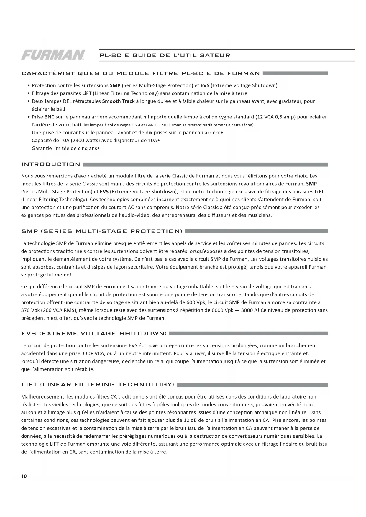 convenience outletdual pull-out lamps10 amp circuit breakerbnc lamp connectorbnc lamp power switchisolated ac outlet banksac inlet with iec femaleto 10a schuko plugfront lamp dimmerstatus indicatorsmaster power switch10 PL-8C E GUIDE DE L’UTILISATEUR CARACTÉRISTIQUES DU MODULE FILTRE PL-8C E DE FURMAN Protecon contre les surtensions • SMP (Series Mul-Stage Protecon) et EVS (Extreme Voltage Shutdown) Filtrage des parasites • LiFT (Linear Filtering Technology) sans contaminaon de la mise à terre Deux lampes DEL rétractables • SmoothTrack à longue durée et à faible chaleur sur le panneau avant, avec gradateur, pour éclairer le bâ Prise BNC sur le panneau arrière accommodant n’importe quelle lampe à col de cygne standard (12 VCA 0,5 amp) pour éclairer • l’arrière de votre bâ (les lampes à col de cygne GN-I et GN-LED de Furman se prêtent parfaitement à cee tâche) Une prise de courant sur le panneau avant et de dix prises sur le panneau arrière• Capacité de 10A (2300 was) avec disjoncteur de 10A• Garane limitée de cinq ans• INTRODUCTION Nous vous remercions d’avoir acheté un module ltre de la série Classic de Furman et nous vous félicitons pour votre choix. Les modules ltres de la série Classic sont munis des circuits de protecon contre les surtensions révoluonnaires de Furman, SMP (Series Mul-Stage Protecon) et EVS (Extreme Voltage Shutdown), et de notre technologie exclusive de ltrage des parasites LiFT (Linear Filtering Technology). Ces technologies combinées incarnent exactement ce à quoi nos clients s’aendent de Furman, soit une protecon et une puricaon du courant AC sans compromis. Notre série Classic a été conçue précisément pour excéder les exigences pointues des professionnels de l’audio-vidéo, des entrepreneurs, des diuseurs et des musiciens. SMP (SERIES MULTI-STAGE PROTECTION) La technologie SMP de Furman élimine presque enèrement les appels de service et les coûteuses minutes de pannes. Les circuits de protecons tradionnels contre les surtensions doivent être réparés lorsqu’exposés à des pointes de tension transitoires, impliquant le démantèlement de votre système. Ce n’est pas le cas avec le circuit SMP de Furman. Les voltages transitoires nuisibles sont absorbés, contraints et dissipés de façon sécuritaire. Votre équipement branché est protégé, tandis que votre appareil Furman se protège lui-même! Ce qui diérencie le circuit SMP de Furman est sa contrainte du voltage imbaable, soit le niveau de voltage qui est transmis à votre équipement quand le circuit de protecon est soumis une pointe de tension transitoire. Tandis que d’autres circuits de protecon orent une contrainte de voltage se situant bien au-delà de 600 Vpk, le circuit SMP de Furman amorce sa contrainte à 376 Vpk (266 VCA RMS), même lorsque testé avec des surtensions à répéon de 6000 Vpk — 3000 A! Ce niveau de protecon sans précédent n’est oert qu’avec la technologie SMP de Furman. EVS (EXTREME VOLTAGE SHUTDOWN) Le circuit de protecon contre les surtensions EVS éprouvé protège contre les surtensions prolongées, comme un branchement accidentel dans une prise 330+ VCA, ou à un neutre intermient. Pour y arriver, il surveille la tension électrique entrante et, lorsqu’il détecte une situaon dangereuse, déclenche un relai qui coupe l’alimentaon jusqu’à ce que la surtension soit éliminée et que l’alimentaon soit rétablie. LIFT (LINEAR FILTERING TECHNOLOGY) Malheureusement, les modules ltres CA tradionnels ont été conçus pour être ulisés dans des condions de laboratoire non réalistes. Les vieilles technologies, que ce soit des ltres à pôles mulples de modes convenonnels, pouvaient en vérité nuire au son et à l’image plus qu’elles n’aidaient à cause des pointes résonnantes issues d’une concepon archaïque non linéaire. Dans certaines condions, ces technologies peuvent en fait ajouter plus de 10 dB de bruit à l’alimentaon en CA! Pire encore, les pointes de tension excessives et la contaminaon de la mise à terre par le bruit issu de l’alimentaon en CA peuvent mener à la perte de données, à la nécessité de redémarrer les préréglages numériques ou à la destrucon de conversseurs numériques sensibles. La technologie LiFT de Furman emprunte une voie diérente, assurant une performance opmale avec un ltrage linéaire du bruit issu de l’alimentaon en CA, sans contaminaon de la mise à terre.11 FRANÇAIS ENGLISH ESPAÑOL DEUTSCH