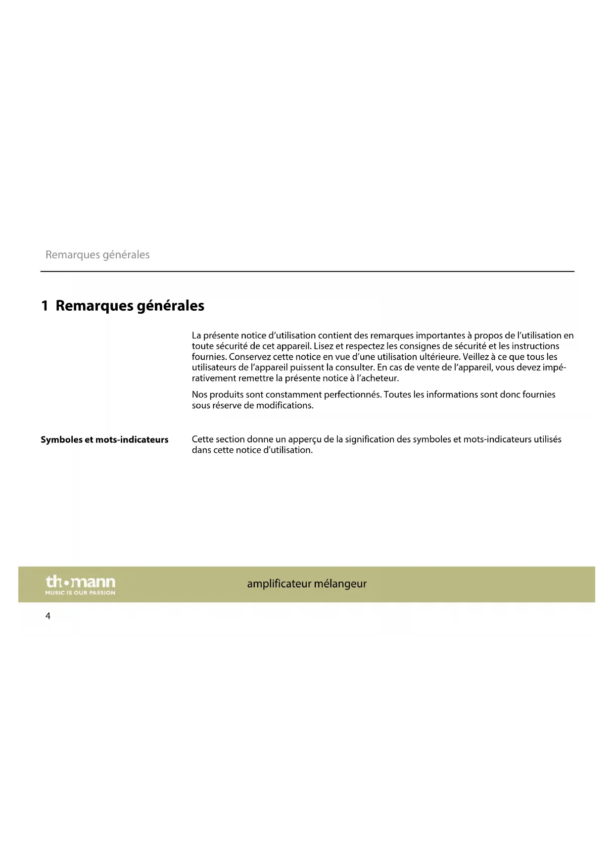 amplificateur mélangeur 4Terme générique Signification DANGER ! Cette association du symbole et du terme générique renvoie à une situation dangereuse directe se traduisant par de graves lésions voire la mort si celle-ci ne peut être évitée. ATTENTION ! Cette association du symbole et du terme générique renvoie à une situation dangereuse potentielle pouvant se traduire par des lésions légères ou moindres si celle-ci ne peut être évitée. REMARQUE ! Cette association du symbole et du terme générique renvoie à une situation dangereuse potentielle pouvant se traduire par des dommages matériels et sur l'environnement si celle- ci ne peut être évitée. Symbole d'avertissement Type de danger Avertissement en cas de tension électrique dangereuse. Remarques générales