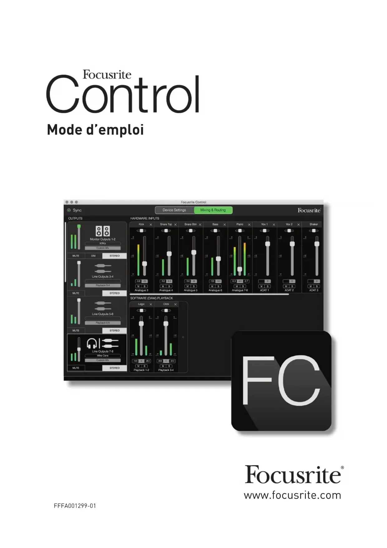 INTRODUCTION Ceci est le mode d'emploi de Focusrite Control, le logiciel qui a été conçu spécifiquement pour l'emploi avec la gamme d'interfaces Thunderbolt™ Clarett de Focusrite. Si vous venez juste d'acquérir une interface Clarett, vous aurez besoin à la fois de ce mode d'emploi et du mode d'emploi de votre matériel. Vous pouvez télécharger le mode d'emploi du matériel sur http://uk.focusrite.com/downloads. L'association des excellentes performances audio et de la qualité de fabrication professionnelle de la Clarett avec l'interface simple et intuitive de Focusrite Control vous fournit, en conjonction avec la station de travail audio numérique (STAN) que vous préférez, un système d'enregistrement informatique extrêmement polyvalent. Bien que nous ayons conçu Focusrite Control pour être aussi intuitif et orienté production que possible, tous les utilisateurs auront intérêt à lire la totalité de ce mode d'emploi car une compréhension complète des fonctionnalités du logiciel ne peut être obtenue que dans le cadre de son association avec le matériel connecté. IMPORTANT La gamme d'interfaces Clarett est composée de plusieurs modèles différents qui utilisent tous Focusrite Control. La différence fondamentale entre ces modèles tient au nombre d'entrées et de sorties que chacune offre, et au nombre de fonctionnalités qui peuvent être directement contrôlées depuis Focusrite Control. Les plus petits modèles Clarett ont moins d'entrées et de sorties et de fonctions contrôlées par logiciel que les modèles aux caractéristiques plus élevées, comme par exemple la Clarett 8PreX. Focusrite Control reconnaîtra l'interface Clarett à laquelle votre ordinateur est connecté et se configurera en conséquence. Vous ne verrez donc à l'écran que les entrées et sorties que prend véritablement en charge votre interface. En raison de cette configuration automatique, ce mode d'emploi s'applique à tous les modèles de la gamme Clarett. Nous avons estimé qu'illustrer ce mode d'emploi avec des copies d'écran de plusieurs modèles rendrait la lecture confuse, aussi avons nous choisi d'utiliser la Clarett 8Pre comme modèle « de référence » pour ce mode d'emploi. Si votre Clarett est une 8Pre, les copies d'écran de ce mode d'emploi correspondent exactement à ce que vous voyez sur votre écran. Si vous avez un modèle différent, les seules différences significatives dans les écrans tiennent au nombre disponible d'entrées et de sorties ainsi que de fonctions contrôlées par logiciel.4 Configurations requises IMPORTANT Veuillez utiliser le lien suivant pour accéder à des informations actualisées sur la compatibilité des ordinateurs et systèmes d'exploitation pour Focusrite Control et tous les produits Clarett : www.focusrite.com/clarett/compatibility Installation des logiciels Focusrite Control peut être téléchargé depuis le site web de Focusrite (www.focusrite.com/register). Le guide de prise en main fourni avec votre interface Clarett contient les codes de validation que vous devrez saisir à l'adresse web ci-dessus. Cette procédure vous garantit de disposer des toutes dernières versions des logiciels.