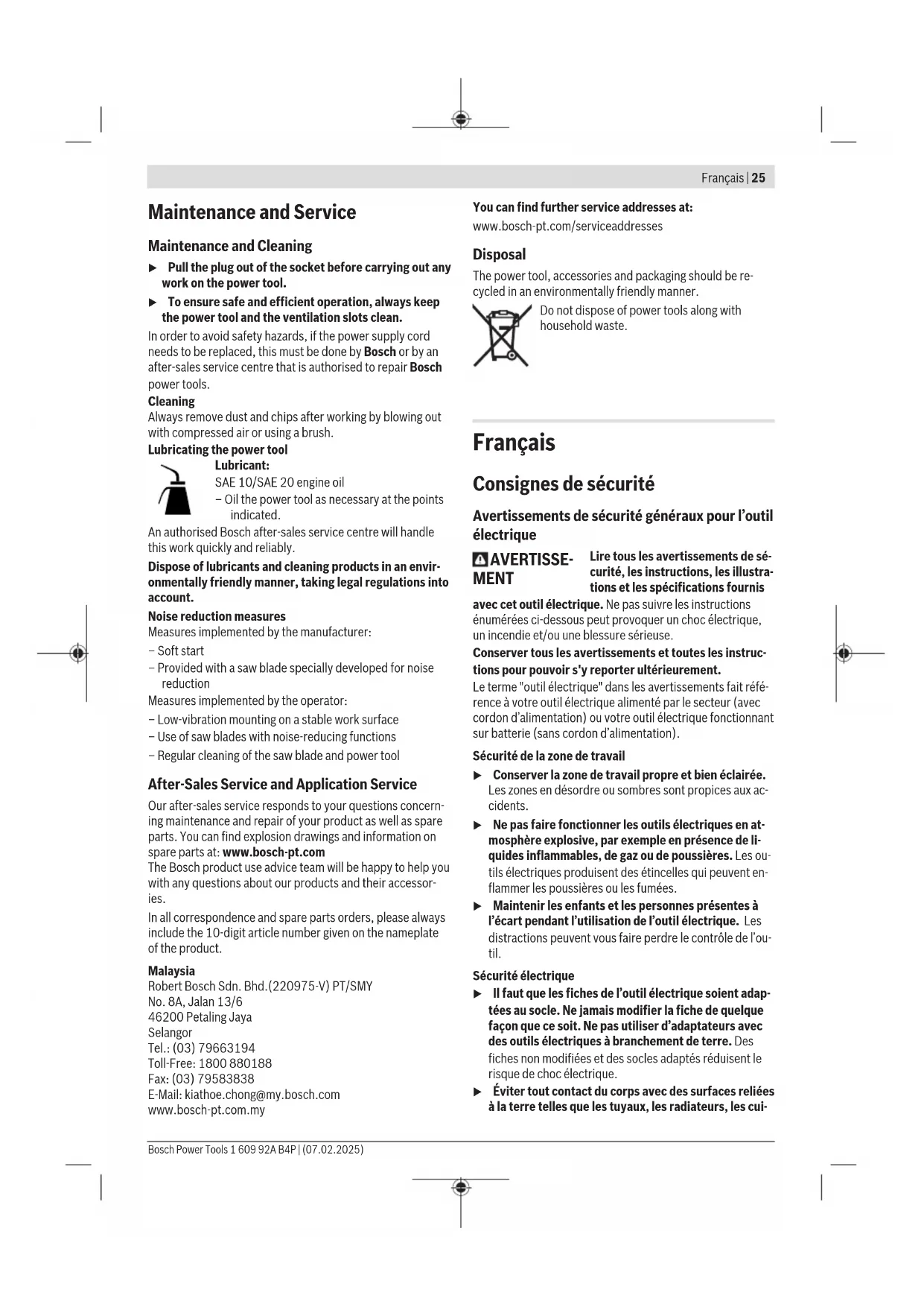 Anti-kickback pawls(7) Place in storage compartment(33) M Angle guide(3) with profile rail(50) Slide into the storage com- partment holders(29) N Parallel guide(9) with fitted addi- tional parallel guide(47) Place in storage compartment(12) N Push stick(15) Place in storage compartment(21) 1 609 92A B4P | (07.02.2025) Bosch Power ToolsFrançais | 25 Maintenance and Service Maintenance and Cleaning u Pull the plug out of the socket before carrying out any work on the power tool. u To ensure safe and efficient operation, always keep the power tool and the ventilation slots clean. In order to avoid safety hazards, if the power supply cord needs to be replaced, this must be done by Bosch or by an after-sales service centre that is authorised to repair Bosch power tools. Cleaning Always remove dust and chips after working by blowing out with compressed air or using a brush. Lubricating the power tool Lubricant: SAE 10/SAE 20 engine oil – Oil the power tool as necessary at the points indicated. An authorised Bosch after-sales service centre will handle this work quickly and reliably. Dispose of lubricants and cleaning products in an envir- onmentally friendly manner, taking legal regulations into account. Noise reduction measures Measures implemented by the manufacturer: – Soft start – Provided with a saw blade specially developed for noise reduction Measures implemented by the operator: – Low-vibration mounting on a stable work surface – Use of saw blades with noise-reducing functions – Regular cleaning of the saw blade and power tool After-Sales Service and Application Service Our after-sales service responds to your questions concern- ing maintenance and repair of your product as well as spare parts. You can find explosion drawings and information on spare parts at: www.bosch-pt.com The Bosch product use advice team will be happy to help you with any questions about our products and their accessor- ies. In all correspondence and spare parts orders, please always include the 10‑digit article number given on the nameplate of the product. Malaysia Robert Bosch Sdn. Bhd.(220975-V) PT/SMY No. 8A, Jalan 13/6 46200 Petaling Jaya Selangor Tel.: (03) 79663194 Toll-Free: 1800 880188 Fax: (03) 79583838 E-Mail: kiathoe.chong@my.bosch.com www.bosch-pt.com.my You can find further service addresses at: www.bosch-pt.com/serviceaddresses Disposal The power tool, accessories and packaging should be re- cycled in an environmentally friendly manner. Do not dispose of power tools along with household waste. Français Consignes de sécurité Avertissements de sécurité généraux pour l’outil électrique AVERTISSE- MENT Lire tous les avertissements de sé- curité, les instructions, les illustra- tions et les spécifications fournis avec cet outil électrique. Ne pas suivre les instructions énumérées ci-dessous peut provoquer un choc électrique, un incendie et/ou une blessure sérieuse. Conserver tous les avertissements et toutes les instruc- tions pour pouvoir s'y reporter ultérieurement. Le terme "outil électrique" dans les avertissements fait réfé- rence à votre outil électrique alimenté par le secteur (avec cordon d’alimentation) ou votre outil électrique fonctionnant sur batterie (sans cordon d’alimentation). Sécurité de la zone de travail u Conserver la zone de travail propre et bien éclairée. Les zones en désordre ou sombres sont propices aux ac- cidents. u Ne pas faire fonctionner les outils électriques en at- mosphère explosive, par exemple en présence de li- quides inflammables, de gaz ou de poussières. Les ou- tils électriques produisent des étincelles qui peuvent en- flammer les poussières ou les fumées. u Maintenir les enfants et les personnes présentes à l’écart pendant l’utilisation de l’outil électrique. Les distractions peuvent vous faire perdre le contrôle de l’ou- til. Sécurité électrique u Il faut que les fiches de l’outil électrique soient adap- tées au socle. Ne jamais modifier la fiche de quelque façon que ce soit. Ne pas utiliser d’adaptateurs avec des outils électriques à branchement de terre. Des fiches non modifiées et des socles adaptés réduisent le risque de choc électrique. u Éviter tout contact du corps avec des surfaces reliées à la terre telles que les tuyaux, les radiateurs, les cui- Bosch Power Tools 1 609 92A B4P | (07.02.2025)26 | Français sinières et les réfrigérateurs. Il existe un risque accru de choc électrique si votre corps est relié à la terre. u Ne pas exposer les outils électriques à la pluie ou à des conditions humides. La pénétration d‘eau à l’intérieur d’un outil électrique augmente le risque de choc élec- trique. u Ne pas maltraiter le cordon. Ne jamais utiliser le cor- don pour porter, tirer ou débrancher l’outil électrique. Maintenir le cordon à l’écart de la chaleur, du lubri- fiant, des arêtes vives ou des parties en mouvement. Des cordons endommagés ou emmêlés augmentent le risque de choc électrique. u Lorsqu’on utilise un outil électrique à l’extérieur, utili- ser un prolongateur adapté à l’utilisation extérieure. L’utilisation d’un cordon adapté à l’utilisation extérieure réduit le risque de choc électrique. u Si l'usage d'un outil électrique dans un emplacement humide est inévitable, utiliser une alimentation proté- gée par un dispositif à courant différentiel résiduel (RCD). L'usage d'un RCD réduit le risque de choc élec- trique. Sécurité des personnes u Rester vigilant, regarder ce que vous êtes en train de faire et faire preuve de bon sens dans votre utilisation de l’outil électrique. Ne pas utiliser un outil électrique lorsque vous êtes fatigué ou sous l’emprise de drogues, de l’alcool ou de médicaments. Un moment d’inattention en cours d’utilisation d’un outil électrique peut entraîner des blessures graves. u Utiliser un équipement de protection individuelle. Toujours porter une protec
