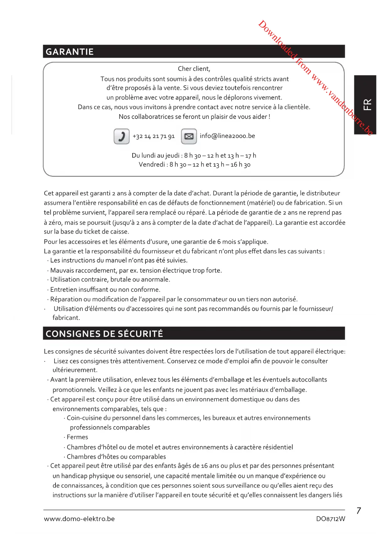 - Ne laissez pas l’appareil sans surveillance lorsqu’il est en état de marche. Assurez-vous que rien entre en contact avec l’élément chauant. Downloaded from www.vandenborre.be9 DO8712W www.domo-elektro.be