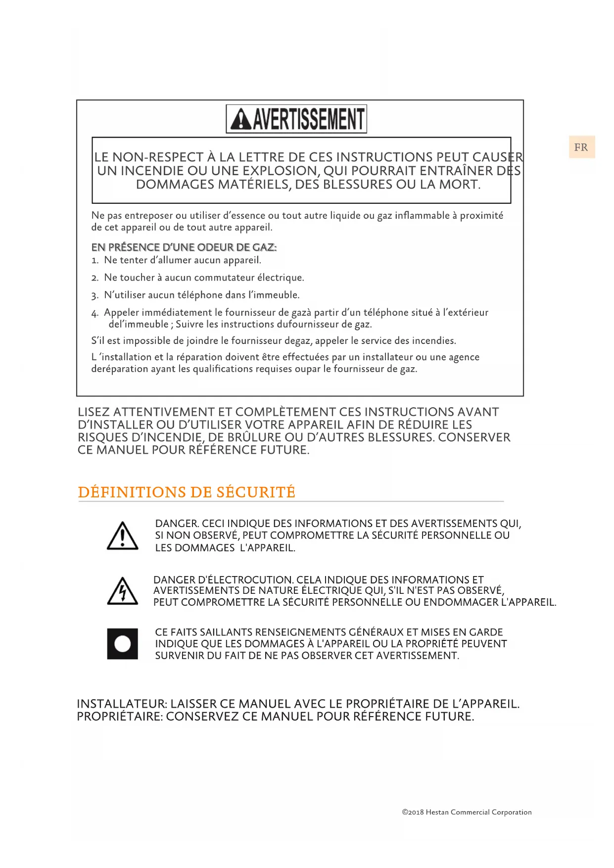 Débranchez l’alimentation avant d’installer ou d’entretenir l’appareil. Avant de le mettre sous tension, assurez-vous que toutes les commandes sont en position «OFF». Ne pas le faire peut entraîner la mort ou un choc électrique. ©2018 Hestan Commercial Corporation 1©2018 Hestan Commercial Corporation