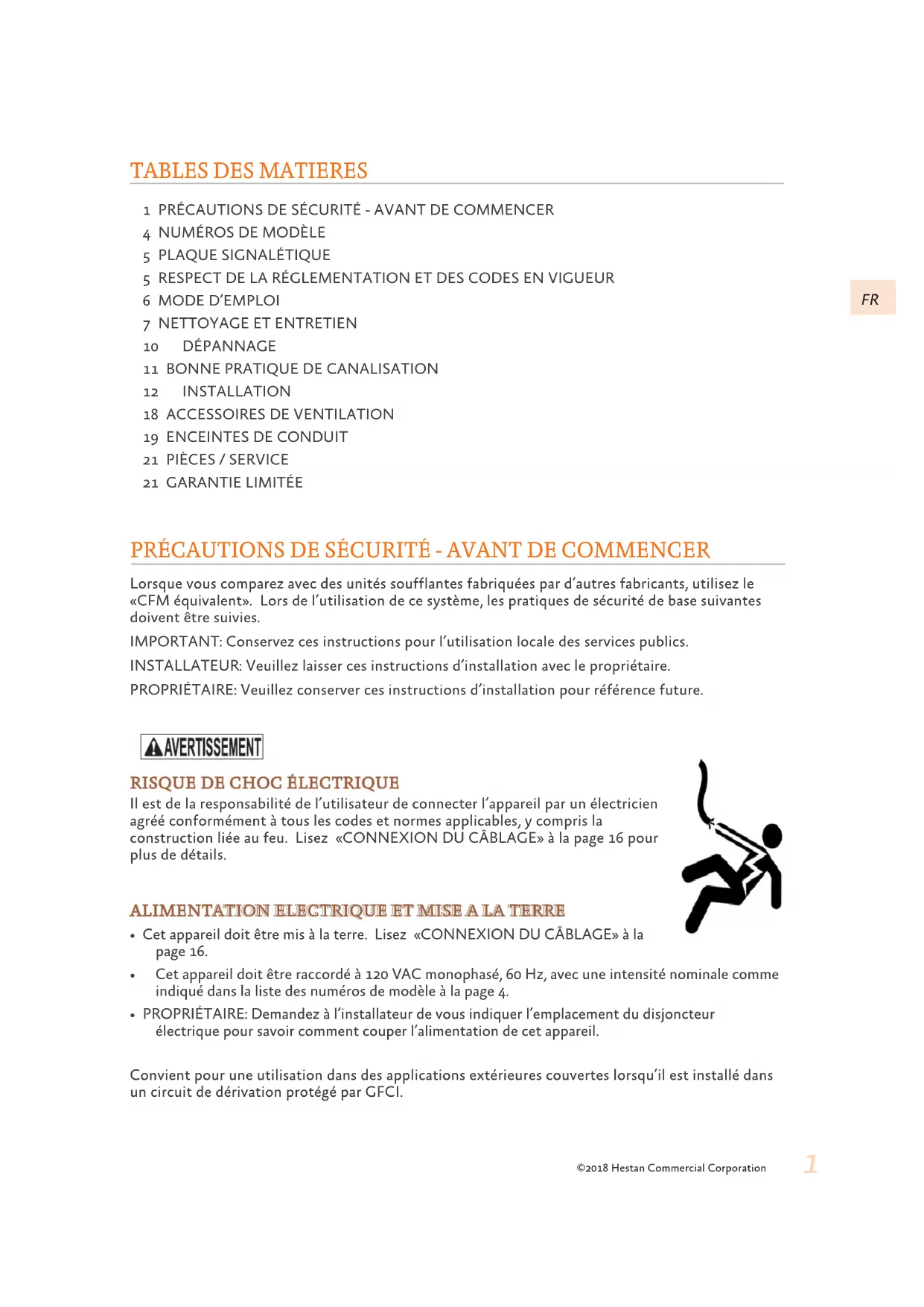 ©2018 Hestan Commercial Corporation 2d) Utilisez un extincteur UNIQUEMENT si:1) Vous savez que vous avez un extincteur de classe ABC, et vous savez déjà comment l’utiliser.2) Le feu est petit et contenu dans la zone où il a commencé.3) Le service d’incendie est appelé.4) Vous pouvez combattre le feu avec votre dos à une sortie.POUR RÉDUIRE LE RISQUE D’INCENDIE OU D’ÉLECTROCUTION, NE PAS UTILISER CE VENTILATEUR AVEC UN DISPOSITIF DE COMMANDE DE VITESSE À L’ÉTAT SOLIDE. RISQUE DE BRÛLURECe système de ventilation est conçu pour être utilisé avec des poêles ou tables de cuisson, qui peuvent devenir très chauds pendant le fonctionnement. Respectez les avertissements et les mises en garde concernant l’appareil de cuisson.