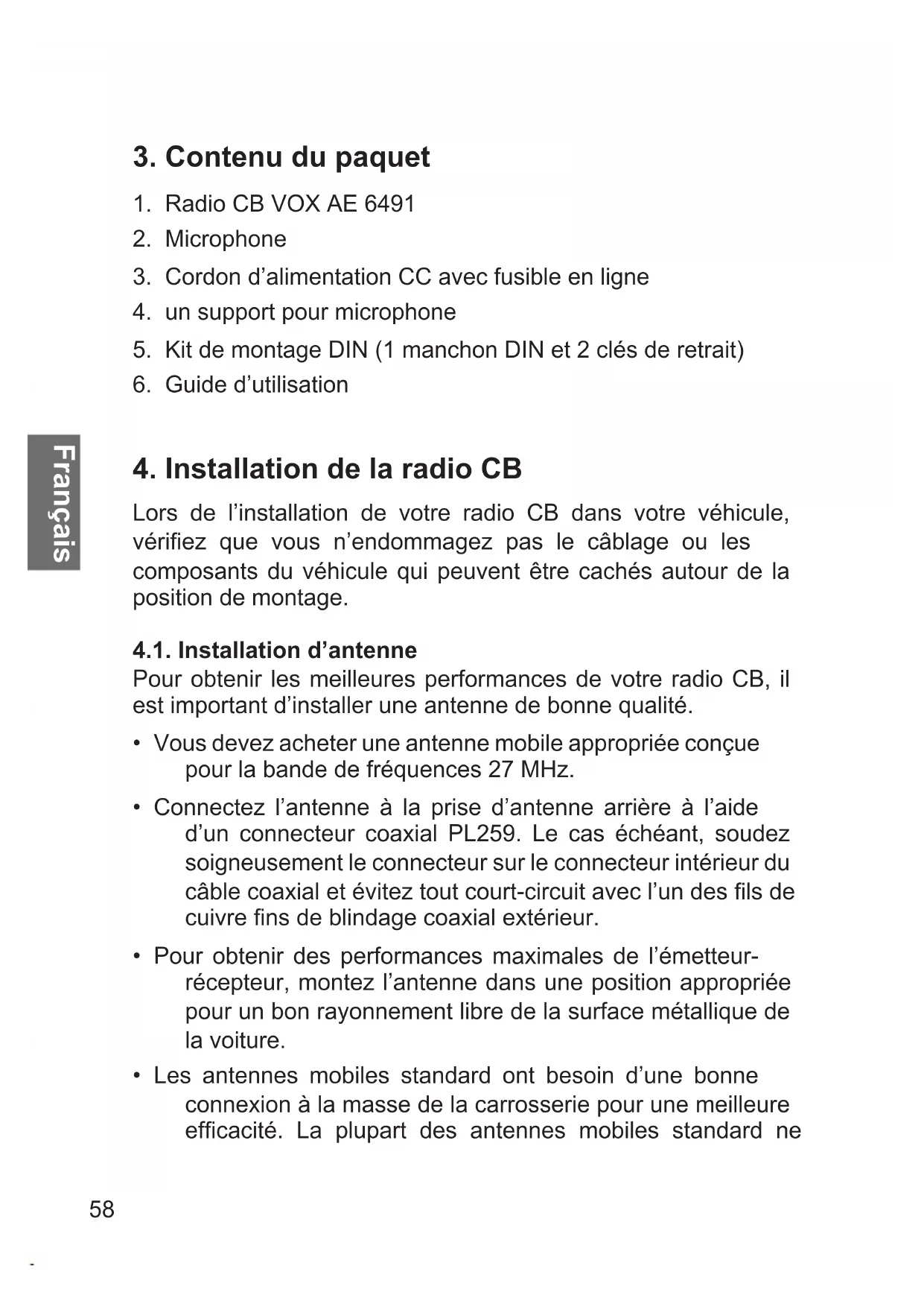 - Vous devez acheter une antenne mobile appropriée conçue pour la bande de fréquences 27 MHz.