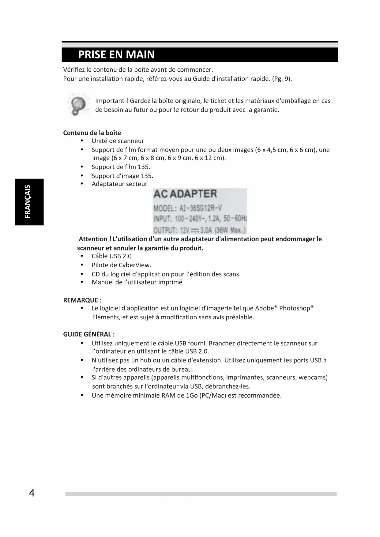Attention!L’utilisati ond'unautreadaptateurd'alimentationpeutendommagerle scanneuretannulerlagarantieduproduit. CâbleUSB2.0 PilotedeCyberView. CDdulogicield'applicationpourl’éditiondesscans. Manueldel'utilisateurimprimé