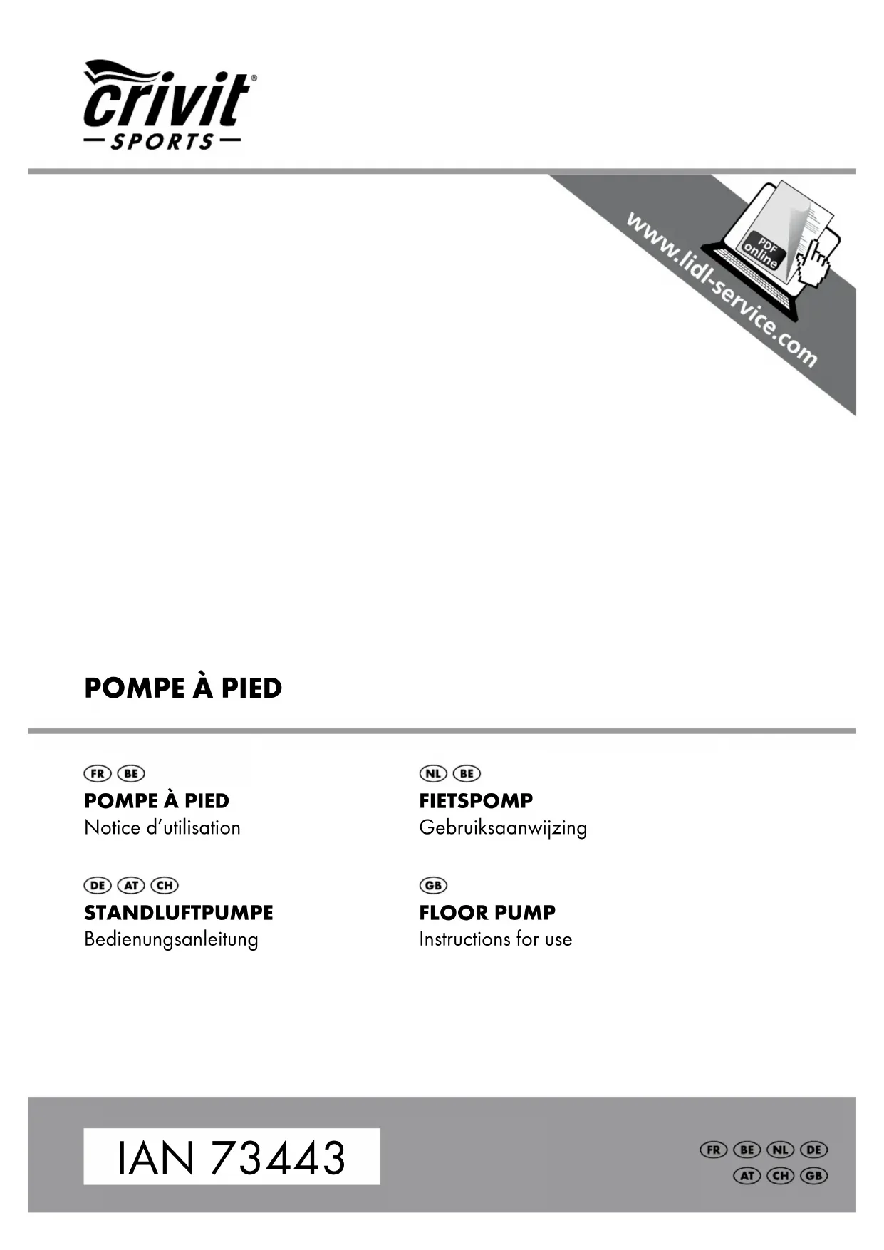 IAN 73443 POMPE À PIED STANDLUFTPUMPE Bedienungsanleitung POMPE À PIED Notice d’utilisation FLOOR PUMP Instructions for use FIETSPOMP Gebruiksaanwijzing2 Nous vous félicitons de l’achat de ce produit de haute qualité. Le mode d’emploi est un élément essentiel de ce produit. Il contient des indications importantes re- latives à la sécurité, à l’utilisation et au traitement des déchets. Veuillez lire attentivement les indi- cations d’utilisation et de sécurité avant d’utiliser le produit. Utilisez le produit uniquement comme décrit et pour les domaines d’application indi- qués. Les documents sont à transmettre à toute tierce personne en cas de cessation du produit à cette dernière. Volume de livraison 1 x mode d‘emploi 1 x pompe à pied 1 x adaptateur pour balles (G) 2 x adaptateurs pour les articles à gonfler (H) Données techniques Pression nominale : 6 bars / 87 PSI Dimensions : 22,5 x 14 x 63 cm (L x l x h) Utilisation conforme Cet article a été conçu pour une utilisation dans le domaine privé afin de gonfler tous les pneus traditionnels des vélos à valve Schrader, valve rapide et sclaverand ainsi que pour gonfler les balles, les matelas pneumatiques et les articles à gonfler similaires. Indications de sécurité Risque de blessure !