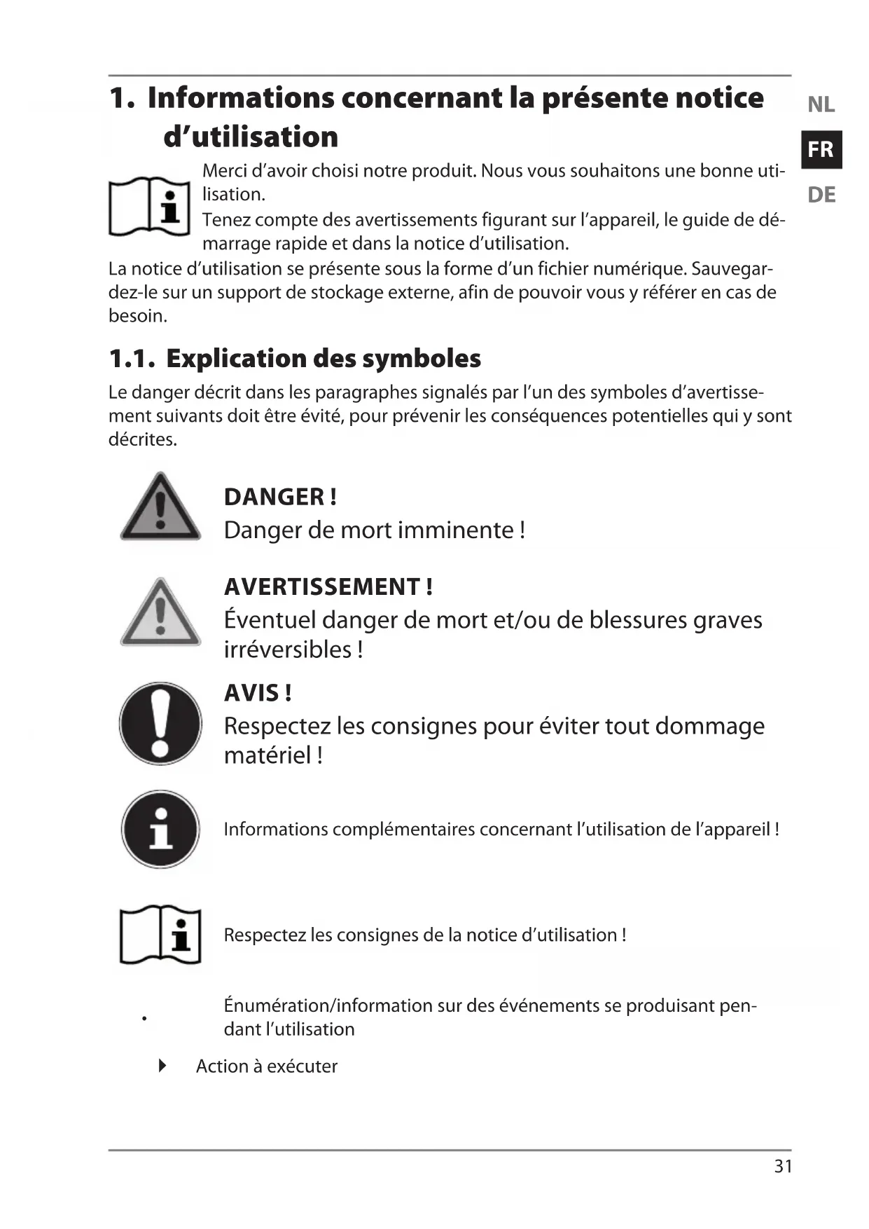 d’utilisation Merci d’avoir choisi notre produit. Nous vous souhaitons une bonne uti- lisation. Tenez compte des avertissements figurant sur l’appareil, le guide de dé- marrage rapide et dans la notice d’utilisation. La notice d’utilisation se présente sous la forme d’un fichier numérique. Sauvegar- dez-le sur un support de stockage externe, afin de pouvoir vous y référer en cas de besoin. 1.1. Explication des symboles Le danger décrit dans les paragraphes signalés par l’un des symboles d’avertisse- ment suivants doit être évité, pour prévenir les conséquences potentielles qui y sont décrites. DANGER ! Danger de mort imminente ! AVERTISSEMENT ! Éventuel danger de mort et/ou de blessures graves irréversibles ! AVIS ! Respectez les consignes pour éviter tout dommage matériel ! Informations complémentaires concernant l’utilisation de l’appareil ! Respectez les consignes de la notice d’utilisation !