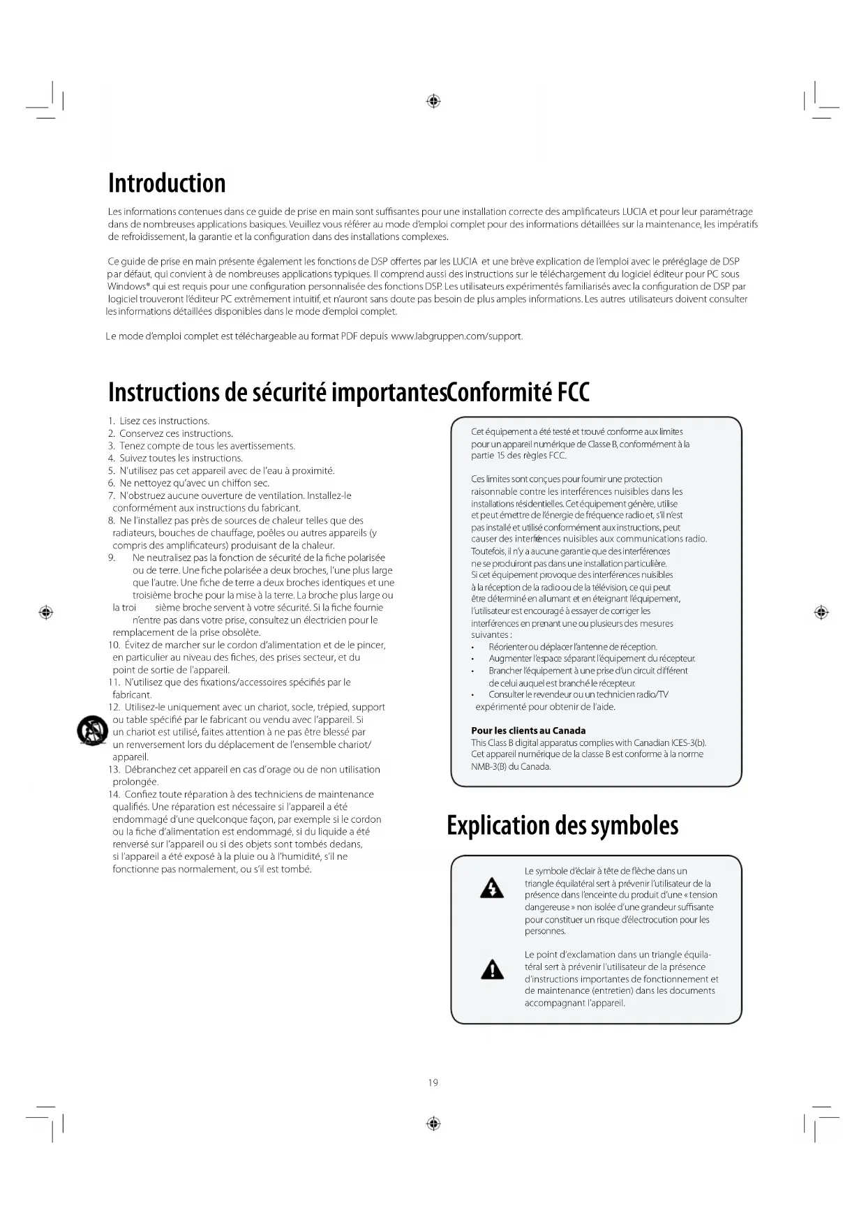 qualifiés. Une réparation est nécessaire si l’appareil a été endommagé d’une quelconque façon, par exemple si le cordon ou la fiche d’alimentation est endommagé, si du liquide a été renversé sur l’appareil ou si des objets sont tombés dedans, si l’appareil a été exposé à la pluie ou à l’humidité, s’il ne fonctionne pas normalement, ou s’il est tombé. Conformité FCC Explication des symboles Introduction Les informations contenues dans ce guide de prise en main sont suffisantes pour une installation correcte des amplificateurs LUCIA et pour leur paramétrage dans de nombreuses applications basiques. Veuillez vous référer au mode d’emploi complet pour des informations détaillées sur la maintenance, les impératifs de refroidissement, la garantie et la configuration dans des installations complexes. Ce guide de prise en main présente également les fonctions de DSP offertes par le s LUCIA et une brève explication de l’empl va i o ec le préréglage de DSP par défaut, qui convient à de nombreuses applications typiques. Il comprend aussi des instructions sur le téléchargement du logiciel éditeur pour PC sous Windows® qui est requis pour une configuration personnalisée des fonctions DSP. Les utilisateurs expérimentés familiarisés avec la configuration de DSP par logiciel trouveront l’éditeur PC extrêmement intuitif, et n’auront sans doute pa s besoin de plus amples informations. Les autres utilisateurs doivent consulter les informations détaillées disponibles dans le mode d’emploi complet. Le mode d’emploi complet est téléchargeable au format PDF depuis www.labgruppen.com/support. Le symbole d’éclair à tête de flèche dans un triangle équilatéral sert à prévenir l’utilisateur de la présence dans l’enceinte du produit d’une « tension dangereuse » non isolée d’une grandeur suffisante pour constituer un risque d’électrocution pour les personnes. Le point d’exclamation dans un triangle équila- téral sert à prévenir l’utilisateur de la présence d’instructions importantes de fonctionnement et de maintenance (entretien) dans les documents accompagnant l’appareil. Cet équipement a été testé et trouvé conforme aux limites pour un appareil numérique de Classe B, conformément à la