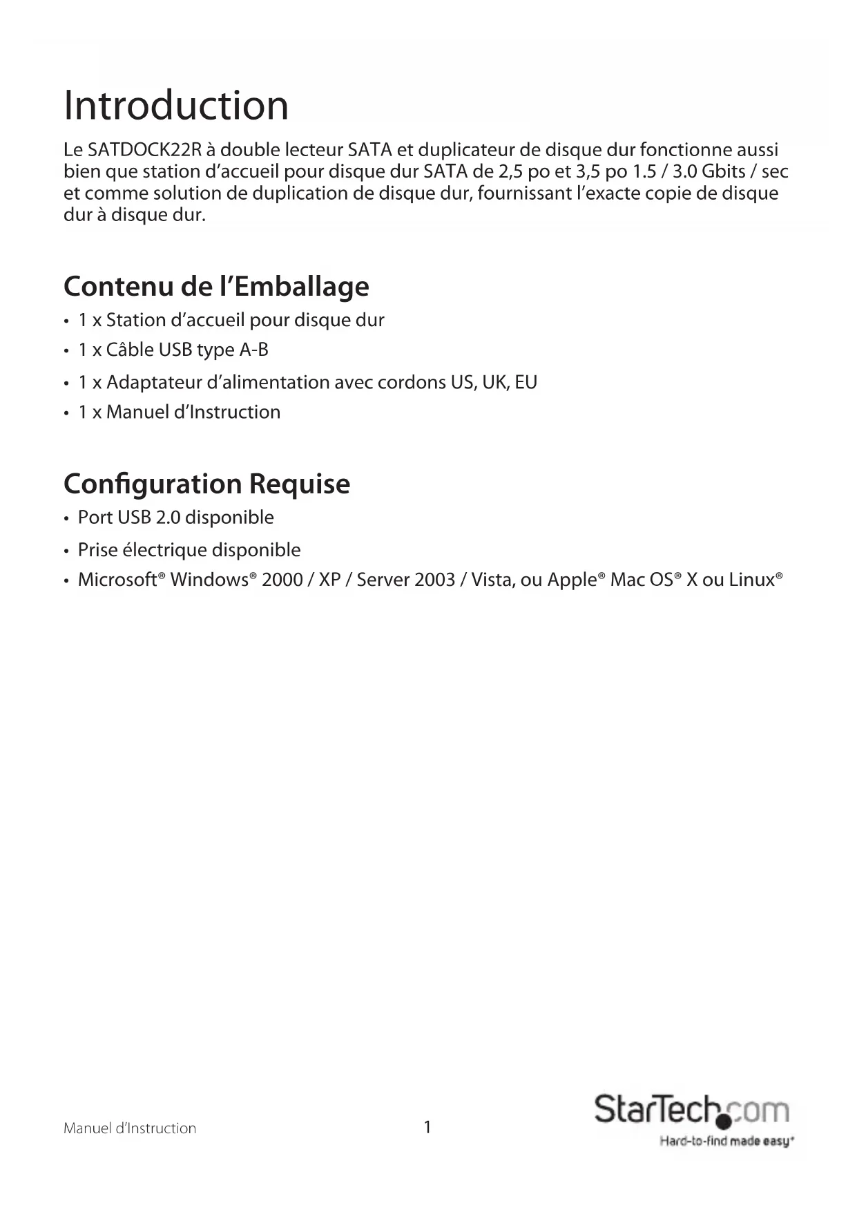 Retrouvez gratuitement la notice de l'appareil SATDOCK22R StarTech.com au format PDF.