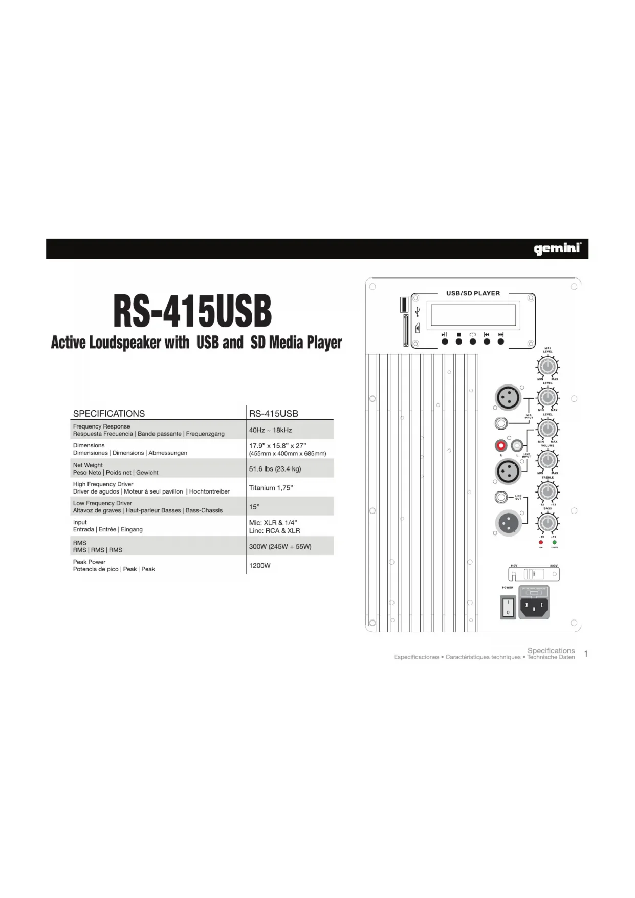 RS415USB - Haut-parleur GEMINI - Notice d'utilisation et mode d'emploi gratuit