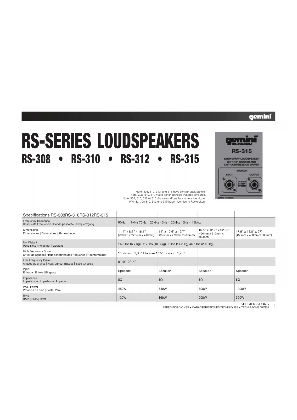 RS310 - Haut-parleur GEMINI - Notice d'utilisation et mode d'emploi gratuit