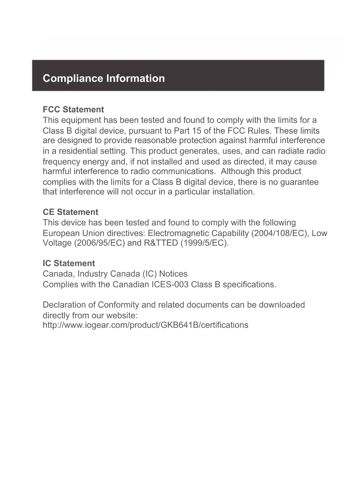 correctement jumelé avec le périphérique. Remarque: Le KeySlate ne peut être jumelé à un seul périphérique iOS ou un ordinateur à la fois.Déclaration de la FCC Cet équipement a été testé et est conforme aux limitations établies pour les appareils numériques de classe B, conformément à la section 15 du règlement de la FCC. Ces limitations sont destinées à fournir une protection raisonnable contre les interférences nuisibles en environnement résidentiel. Ce produit génère, utilise et peut émettre une énergie de radiofréquence et, s’il n’est pas installé et utilisé conformément aux instructions, peut causer des interférences nuisibles aux communications radio. Conformité CE Cet appareil a été testé et est conforme aux directives de l’Union européenne suivantes: Capacité électromagnétique (2004/108/EC), Basse tension (2006/95/EC) et R&TTED (1999/5/EC). Avis d'Industrie Canada Cet appareil numérique de la classe B est conforme à la norme NMB-003 du Canada. La déclaration de conformité et documents annexes peuvent être téléchargés sur notre site Web: http://www.iogear.com/product/GKB641B/certifications Déclaration de Conformité Jumeler le KeySlate avec votre périphérique Apple