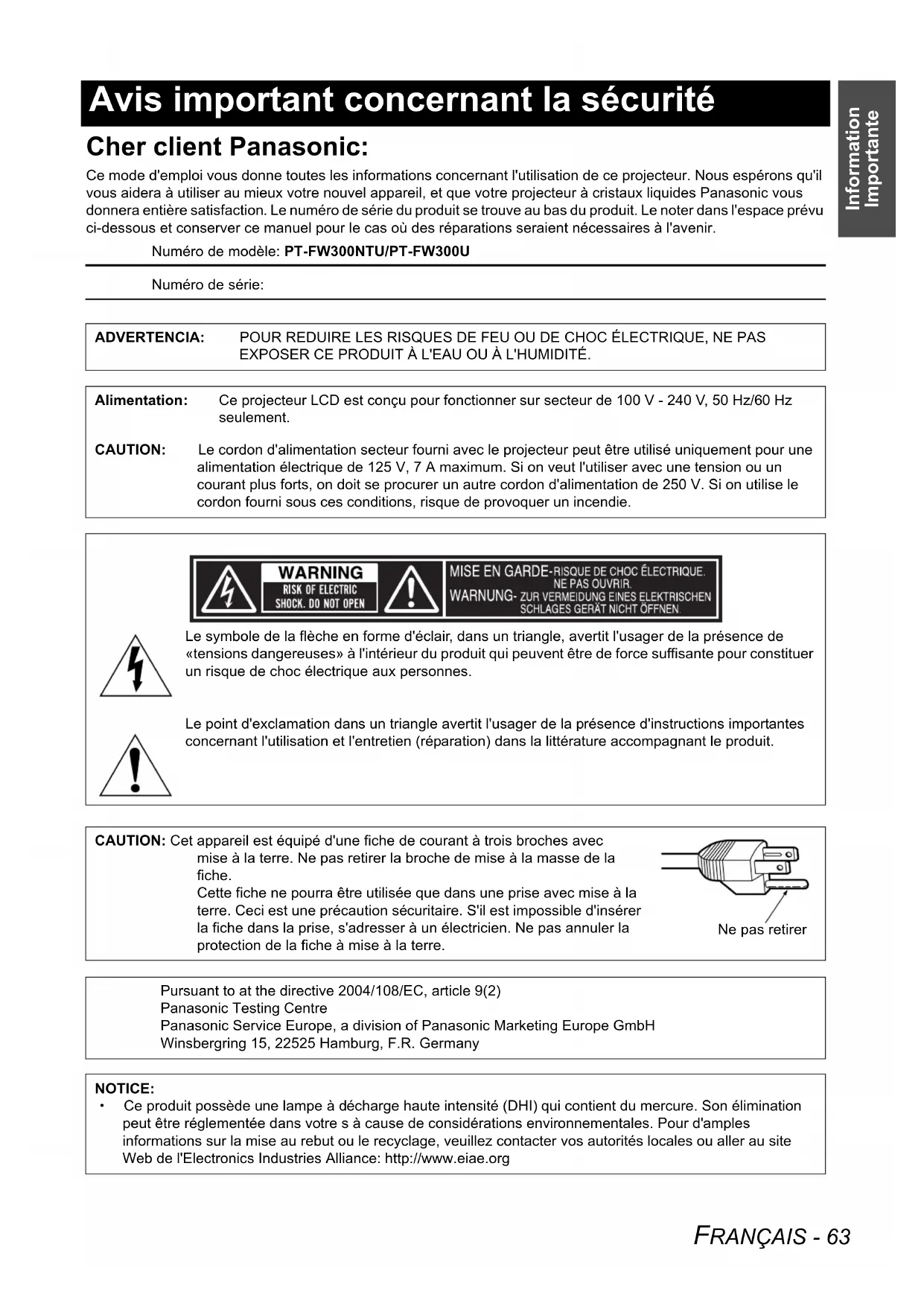 Avis important concernant la sécurité Cher client Panasonic: Ce mode d'emploi vous donne toutes les informations concernant l'utilisation de ce projecteur. Nous espérons qu'il vous aidera à utiliser au mieux votre nouvel appareil, et que votre projecteur à cristaux liquides Panasonic vous donnera entière satisfaction. Le numéro de série du produit se trouve au bas du produit. Le noter dans l'espace prévu ci-dessous et conserver ce manuel pour le cas où des réparations seraient nécessaires à l'avenir. Numéro de modèle: PT-FW300NTU/PT-FW300U Numéro de série: ADVERTENCIA: POUR REDUIRE LES RISQUES DE FEU OU DE CHOC ÉLECTRIQUE, NE PAS EXPOSER CE PRODUIT À L'EAU OU À L'HUMIDITÉ. Alimentation: Ce projecteur LCD est conçu pour fonctionner sur secteur de 100 V - 240 V, 50 Hz/60 Hz seulement. CAUTION: Le cordon d'alimentation secteur fourni avec le projecteur peut être utilisé uniquement pour une alimentation électrique de 125 V, 7 A maximum. Si on veut l'utiliser avec une tension ou un courant plus forts, on doit se procurer un autre cordon d'alimentation de 250 V. Si on utilise le cordon fourni sous ces conditions, risque de provoquer un incendie. Le symbole de la flèche en forme d'éclair, dans un triangle, avertit l'usager de la présence de «tensions dangereuses» à l'intérieur du produit qui peuvent être de force suffisante pour constituer un risque de choc électrique aux personnes. Le point d'exclamation dans un triangle avertit l'usager de la présence d'instructions importantes concernant l'utilisation et l'entretien (réparation) dans la littérature accompagnant le produit. CAUTION: Cet appareil est équipé d'une fiche de courant à trois broches avec mise à la terre. Ne pas retirer la broche de mise à la masse de la fiche. Cette fiche ne pourra être utilisée que dans une prise avec mise à la terre. Ceci est une précaution sécuritaire. S'il est impossible d'insérer la fiche dans la prise, s'adresser à un électricien. Ne pas annuler la protection de la fiche à mise à la terre. Pursuant to at the directive 2004/108/EC, article 9(2) Panasonic Testing Centre Panasonic Service Europe, a division of Panasonic Marketing Europe GmbH Winsbergring 15, 22525 Hamburg, F.R. Germany NOTICE: A Ce produit possède une lampe à décharge haute intensité (DHI) qui contient du mercure. Son élimination peut être réglementée dans votre s à cause de considérations environnementales. Pour d'amples informations sur la mise au rebut ou le recyclage, veuillez contacter vos autorités locales ou aller au site Web de l'Electronics Industries Alliance: http://www.eiae.org Ne pas retirerInformation Importante Avis important concernant la sécurité