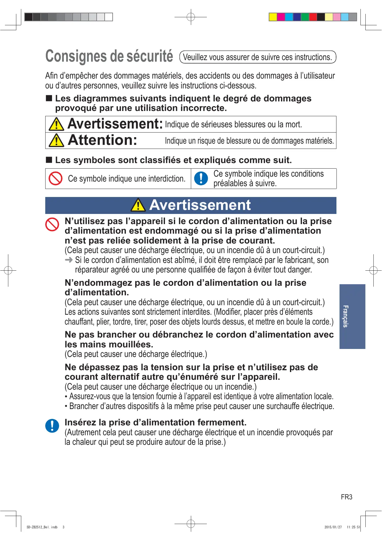 Indique un risque de blessure ou de dommages matériels. Attention: wLes symboles sont classifiés et expliqués comme suit. Ce symbole indique les conditions Ce symbole indique une interdiction. préalables à suivre. Avertissement Français N’utilisez pas l’appareil si le cordon d’alimentation ou la prise d’alimentation est endommagé ou si la prise d’alimentation n’est pas reliée solidement à la prise de courant. (Cela peut causer une décharge électrique, ou un incendie dû à un court-circuit.) « Si le cordon d’alimentation est abîmé, il doit être remplacé par le fabricant, son réparateur agréé ou une personne qualifiée de façon à éviter tout danger. N’endommagez pas le cordon d’alimentation ou la prise d’alimentation. (Cela peut causer une décharge électrique, ou un incendie dû à un court-circuit.) Les actions suivantes sont strictement interdites. (Modifier, placer près d’éléments chauffant, plier, tordre, tirer, poser des objets lourds dessus, et mettre en boule la corde.) Ne pas brancher ou débranchez le cordon d’alimentation avec les mains mouillées. (Cela peut causer une décharge électrique.) Ne dépassez pas la tension sur la prise et n’utilisez pas de courant alternatif autre qu’énuméré sur l’appareil. (Cela peut causer une décharge électrique ou un incendie.) Ɣ Assurez-vous que la tension fournie à l’appareil est identique à votre alimentation locale. Ɣ Brancher d’autres dispositifs à la même prise peut causer une surchauffe électrique. Insérez la prise d’alimentation fermement. (Autrement cela peut causer une décharge électrique et un incendie provoqués par la chaleur qui peut se produire autour de la prise.) FR3