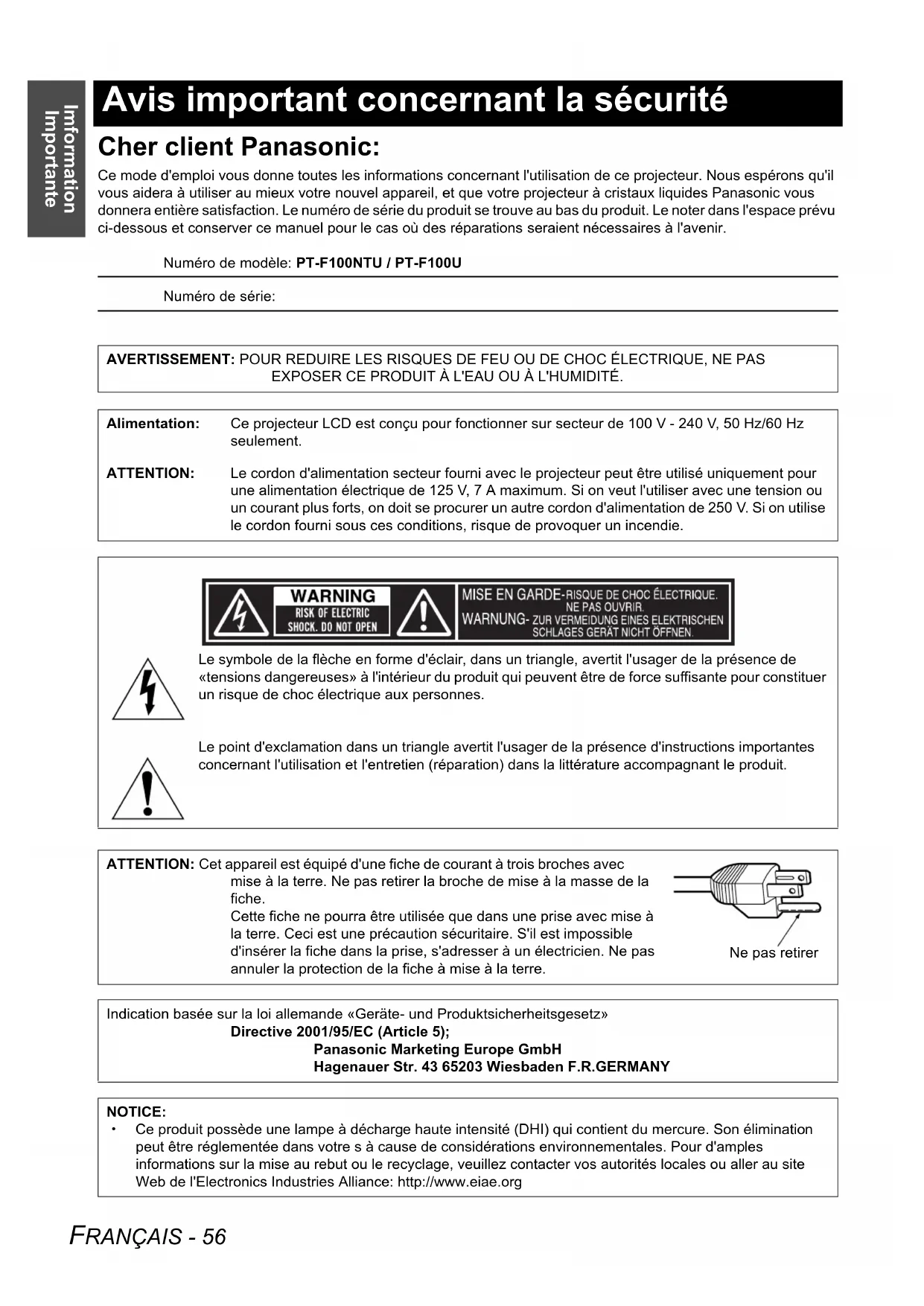 EXPOSER CE PRODUIT À L'EAU OU À L'HUMIDITÉ. Alimentation: Ce projecteur LCD est conçu pour fonctionner sur secteur de 100 V - 240 V, 50 Hz/60 Hz seulement. ATTENTION: Le cordon d'alimentation secteur fourni avec le projecteur peut être utilisé uniquement pour une alimentation électrique de 125 V, 7 A maximum. Si on veut l'utiliser avec une tension ou un courant plus forts, on doit se procurer un autre cordon d'alimentation de 250 V. Si on utilise le cordon fourni sous ces conditions, risque de provoquer un incendie. Le symbole de la flèche en forme d'éclair, dans un triangle, avertit l'usager de la présence de «tensions dangereuses» à l'intérieur du produit qui peuvent être de force suffisante pour constituer un risque de choc électrique aux personnes. Le point d'exclamation dans un triangle avertit l'usager de la présence d'instructions importantes concernant l'utilisation et l'entretien (réparation) dans la littérature accompagnant le produit. ATTENTION: Cet appareil est équipé d'une fiche de courant à trois broches avec mise à la terre. Ne pas retirer la broche de mise à la masse de la fiche. Cette fiche ne pourra être utilisée que dans une prise avec mise à la terre. Ceci est une précaution sécuritaire. S'il est impossible d'insérer la fiche dans la prise, s'adresser à un électricien. Ne pas annuler la protection de la fiche à mise à la terre. Indication basée sur la loi allemande «Geräte- und Produktsicherheitsgesetz» Directive 2001/95/EC (Article 5); Panasonic Marketing Europe GmbH Hagenauer Str. 43 65203 Wiesbaden F.R.GERMANY NOTICE: A Ce produit possède une lampe à décharge haute intensité (DHI) qui contient du mercure. Son élimination peut être réglementée dans votre s à cause de considérations environnementales. Pour d'amples informations sur la mise au rebut ou le recyclage, veuillez contacter vos autorités locales ou aller au site Web de l'Electronics Industries Alliance: http://www.eiae.org Ne pas retirerInformation Importante Avis important concernant la sécurité