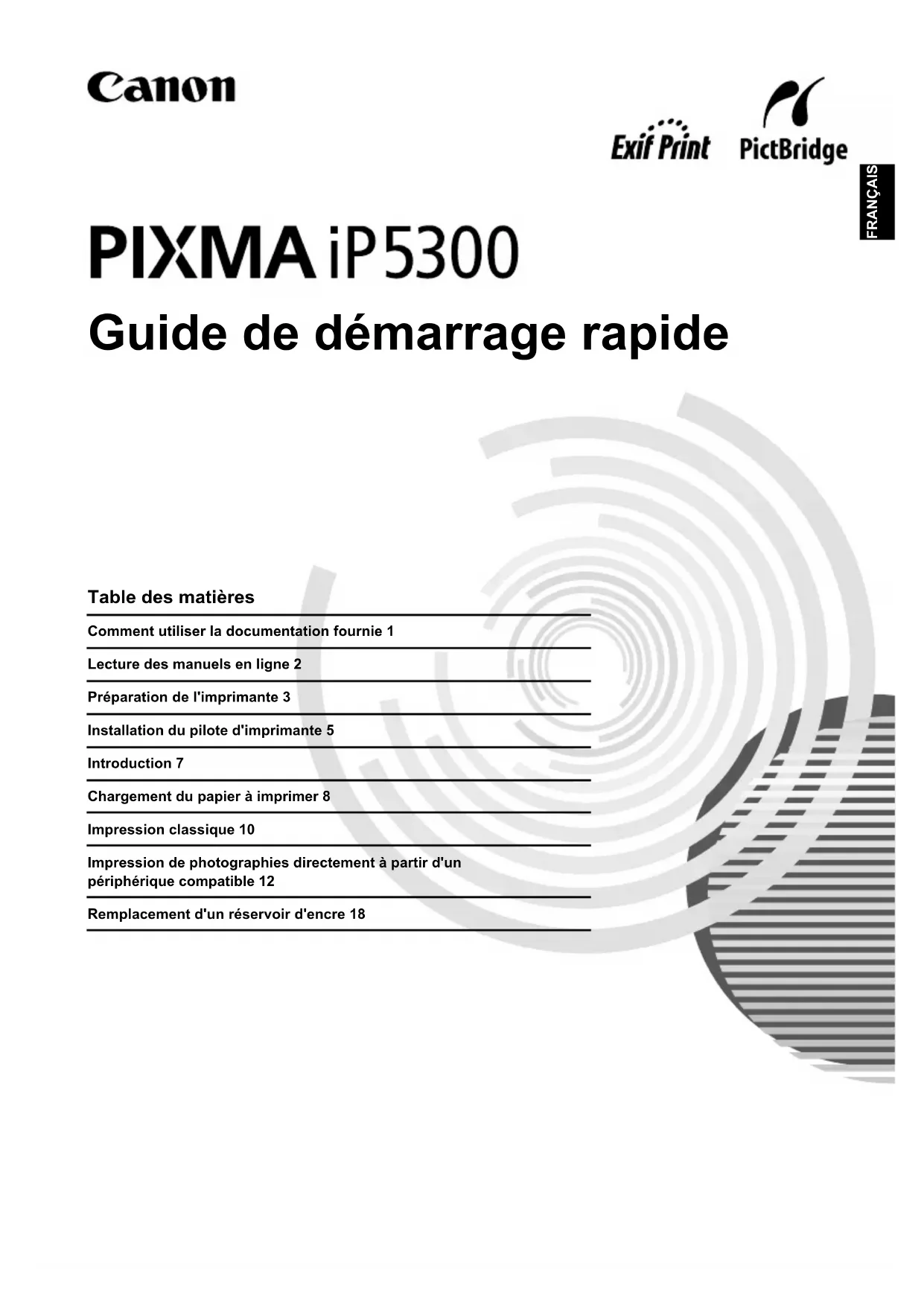 est un programme global qui encourage les économies d’énergie lors de l’utilisation d’ordinateurs et d'autres équipements de bureau. Il soutient le développement et la distribution de produits dotés de fonctions permettant de réduire réellement la consommation d'énergie. Il s'agit d'un système ouvert auquel les entreprises peuvent volontairement prendre part. Les produits ciblés sont les équipements de bureau tels que les ordinateurs, les moniteurs, les imprimantes, les télécopieurs et les photocopieuses. Les normes et les logos de ces produits sont identiques dans tous les pays qui participent au programme. Spécifications électriques N’utilisez jamais de tension autre que la tension secteur du pays d’achat. L'utilisation d'une tension incorrecte risque de causer un incendie ou une décharge électrique. Les tensions et fréquences qui conviennent sont les suivantes : 100-240 V CA, 50/60 Hz A propos des consommables Les consommables (réservoirs d'encre/cartouche FINE (FINE cartridges)) sont disponibles pendant 5 ans après l'arrêt de la production. Précautions de sécurité Numéro de modèle : K10285 (iP5300) Avertissement z N'essayez jamais de brancher le câble d'alimentation sur la prise de courant ou de le débrancher si vos mains sont mouillées. z Veillez à ne jamais endommager, modifier, étirer, plier ou tordre de façon excessive le câble d'alimentation. Ne placez pas d'objets lourds sur le câble d'alimentation. z N'utilisez jamais de source d'alimentation autre que celle fournie dans le pays d'achat. L'utilisation d'une tension et d'une fréquence incorrectes risque de causer un incendie ou une décharge électrique.z Veillez à toujours enfoncer totalement la prise dans la prise de courant. Attention z Pour des raisons de sécurité, gardez les têtes d'impression et les réservoirs d'encre hors de portée des jeunes enfants. z Ne laissez pas tomber les réservoirs d'encre et ne les remuez pas, car l'encre risque de couler et de tacher vos vêtements et vos mains. Lisez également les précautions de sécurité dans le manuel en ligne Guide d'Utilisation. Prêtez attention aux avertissements et précautions de sécurité afin de ne pas vous blesser ou endommager l’imprimante.1Comment utiliser la documentation fournie FRANÇAIS Comment utiliser la documentation fournie Instructions d'installation simplifiée (Notice d'installation) Veillez à lire ce document en premier. Cette notice indique comment installer votre imprimante et préparer son utilisation. Guide de démarrage rapide (ce guide) Lisez ce guide en faisant vos premier pas avec l'imprimante. Après avoir suivi les Instructions d'installation simplifiée (Notice d'installation), nous vous recommandons de lire ce guide pour vous familiariser avec le fonctionnement de base (impression depuis un ordinateur, un périphérique compatible PictBridge, etc.). Manuels en ligne Guide d'Utilisation Lisez ce guide en faisant vos premier pas avec l'imprimante. Si le Guide de démarrage rapide ne vous fournit pas assez d'informations, reportez-vous au Guide d'Utilisation disponible sur le [Setup CD-ROM/CD-ROM d'installation]. Ce guide fournit des instructions détaillées sur les sujets suivants : z Impression depuis votre ordinateur. z Types de supports compatibles. z Entretien régulier. z Dépannage. D'autres guides sont également disponibles pour les fonctions avancées. Guide du pilote d’imprimante Reportez-vous à ce guide pour paramétrer votre pilote d'imprimante. [Photo Application Guide/Guide des applications photographiques] Reportez-vous à ce guide pour savoir comment utiliser les divers logiciels d'applications fournis dans le [Setup CD-ROM/CD-ROM d'installation].2 Lecture des manuels en ligne FRANÇAIS Lecture des manuels en ligne En plus du présent Guide de démarrage rapide, des manuels en ligne sont également fournis avec votre imprimante. Pour plus d'informations sur l'installation des manuels en ligne, reportez-vous aux Instructions d'installation simplifiée (notice d'installation). Pour afficher les manuels en ligne, procédez comme suit : Pour afficher le manuel en ligne, double-cliquez sur l'icône de raccourci Manuel en ligne iP5300 située sur le bureau ou cliquez sur Démarrer > Tous les programmes (ou Programmes)> Manuel Canon iP5300 > Manuel en ligne iP5300. Configuration système Navigateur : visionneuse pour l’aide HTML Windows Pour afficher le manuel en ligne, double-cliquez sur l'alias Manuel en ligne iP5300 situé sur le bureau. Configuration système Navigateur : visionneuse pour l’aide Remarque z Microsoft Internet Explorer