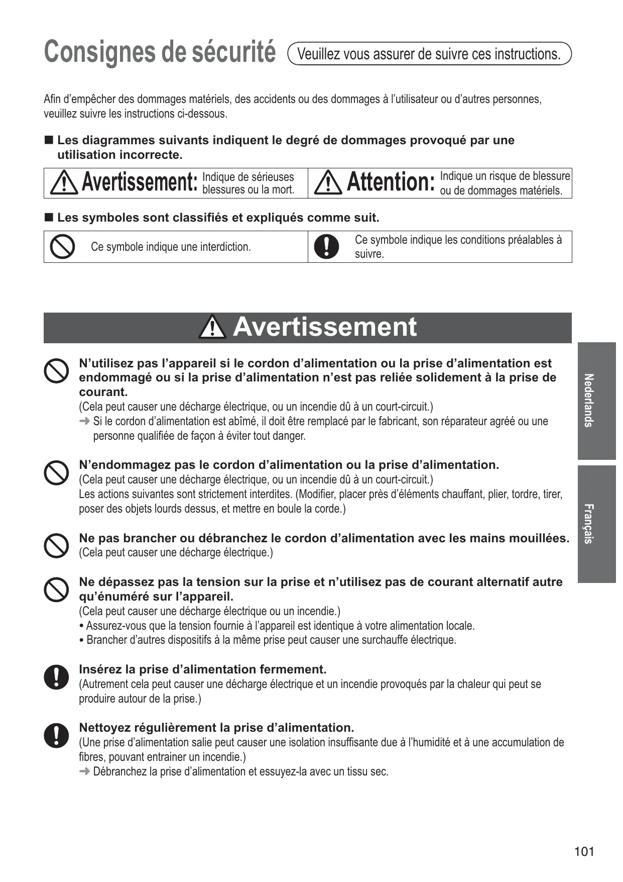 blessures ou la mort. un risque de blessure Attention: Indique ou de dommages matériels. Les symboles sont classifiés et expliqués comme suit. Ce symbole indique une interdiction. Ce symbole indique les conditions préalables à suivre. Avertissement Ne pas brancher ou débranchez le cordon d’alimentation avec les mains mouillées. (Cela peut causer une décharge électrique.) Français N’endommagez pas le cordon d’alimentation ou la prise d’alimentation. (Cela peut causer une décharge électrique, ou un incendie dû à un court-circuit.) Les actions suivantes sont strictement interdites. (Modifier, placer près d’éléments chauffant, plier, tordre, tirer, poser des objets lourds dessus, et mettre en boule la corde.) Nederlands N’utilisez pas l’appareil si le cordon d’alimentation ou la prise d’alimentation est endommagé ou si la prise d’alimentation n’est pas reliée solidement à la prise de courant. (Cela peut causer une décharge électrique, ou un incendie dû à un court-circuit.) Si le cordon d’alimentation est abîmé, il doit être remplacé par le fabricant, son réparateur agréé ou une personne qualifiée de façon à éviter tout danger. Ne dépassez pas la tension sur la prise et n’utilisez pas de courant alternatif autre qu’énuméré sur l’appareil. (Cela peut causer une décharge électrique ou un incendie.) ● Assurez-vous que la tension fournie à l’appareil est identique à votre alimentation locale. ● Brancher d’autres dispositifs à la même prise peut causer une surchauffe électrique. Insérez la prise d’alimentation fermement. (Autrement cela peut causer une décharge électrique et un incendie provoqués par la chaleur qui peut se produire autour de la prise.) Nettoyez régulièrement la prise d’alimentation. (Une prise d’alimentation salie peut causer une isolation insuffisante due à l’humidité et à une accumulation de fibres, pouvant entrainer un incendie.) Débranchez la prise d’alimentation et essuyez-la avec un tissu sec.