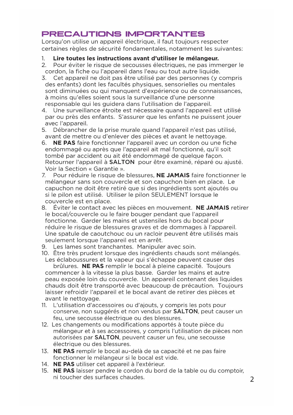 mélangeur et à ses accessoires, y compris l’utilisation de pièces non autorisées par SALTON, peuvent causer un feu, une secousse électrique ou des blessures.