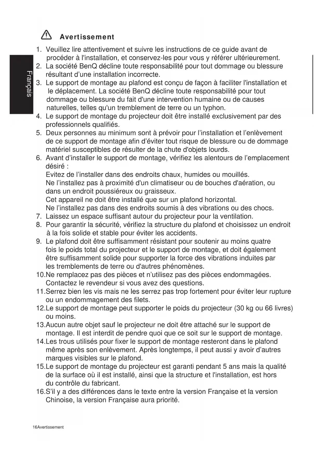 固定Avertissement 16Avertissement Français