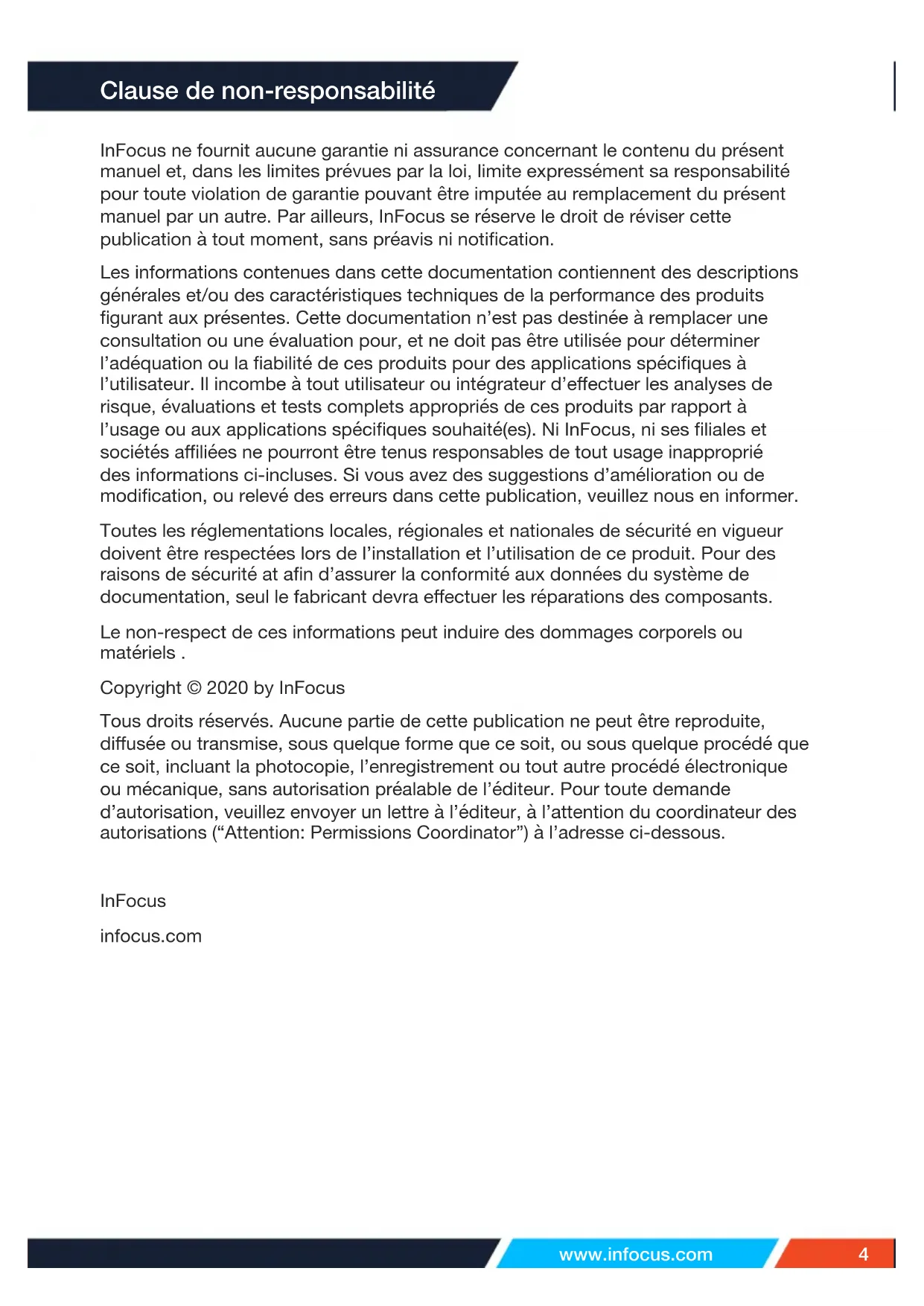 InFocus ne fournit aucune garantie ni assurance concernant le contenu du présent manuel et, dans les limites prévues par la loi, limite expressément sa responsabilité pour toute violation de garantie pouvant être imputée au remplacement du présent manuel par un autre. Par ailleurs, InFocus se réserve le droit de réviser cette publication à tout moment, sans préavis ni notication. Les informations contenues dans cette documentation contiennent des descriptions générales et/ou des caractéristiques techniques de la performance des produits gurant aux présentes. Cette documentation n’est pas destinée à remplacer une consultation ou une évaluation pour, et ne doit pas être utilisée pour déterminer l’adéquation ou la abilité de ces produits pour des applications spéciques à l’utilisateur. Il incombe à tout utilisateur ou intégrateur d’eectuer les analyses de risque, évaluations et tests complets appropriés de ces produits par rapport à l’usage ou aux applications spéciques souhaité(es). Ni InFocus, ni ses liales et sociétés aliées ne pourront être tenus responsables de tout usage inapproprié des informations ci-incluses. Si vous avez des suggestions d’amélioration ou de modication, ou relevé des erreurs dans cette publication, veuillez nous en informer. Toutes les réglementations locales, régionales et nationales de sécurité en vigueur doivent être respectées lors de l’installation et l’utilisation de ce produit. Pour des raisons de sécurité at an d’assurer la conformité aux données du système de documentation, seul le fabricant devra eectuer les réparations des composants. Le non-respect de ces informations peut induire des dommages corporels ou matériels . Copyright © 2020 by InFocus Tous droits réservés. Aucune partie de cette publication ne peut être reproduite, diusée ou transmise, sous quelque forme que ce soit, ou sous quelque procédé que ce soit, incluant la photocopie, l’enregistrement ou tout autre procédé électronique ou mécanique, sans autorisation préalable de l’éditeur. Pour toute demande d’autorisation, veuillez envoyer un lettre à l’éditeur, à l’attention du coordinateur des autorisations (“Attention: Permissions Coordinator”) à l’adresse ci-dessous. InFocus infocus.com Clause de non-responsabilitéwww.infocus.com Marque déposées