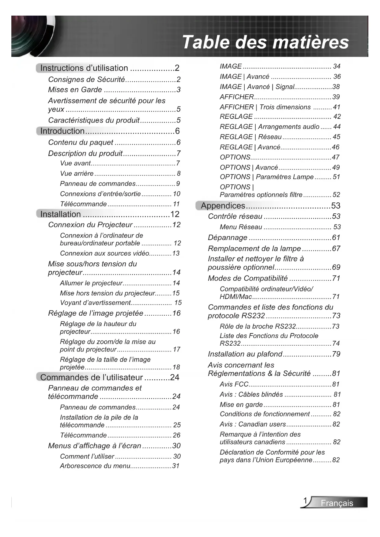 - Remplacement de la lampe p. 67