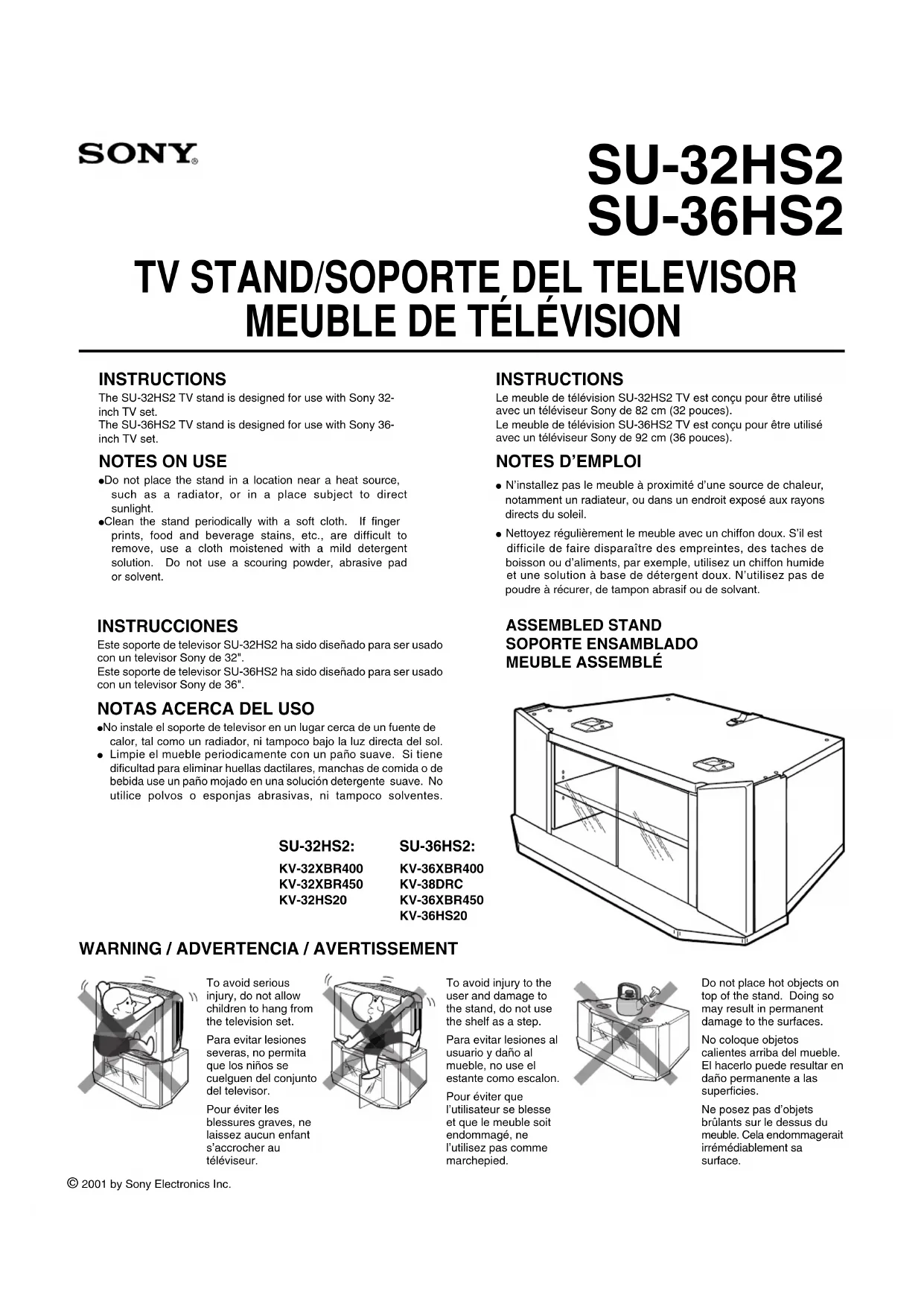 ● Do not place the stand in a location near a heat source,such as a radiator, or in a place subject to directsunlight.● Clean the stand periodically with a soft cloth. If fingerprints, food and beverage stains, etc., are difficult toremove, use a cloth moistened with a mild detergentsolution. Do not use a scouring powder, abrasive pador solvent. INSTRUCTIONS Le meuble de télévision SU-32HS2 TV est conçu pour être utiliséavec un téléviseur Sony de 82 cm (32 pouces).Le meuble de télévision SU-36HS2 TV est conçu pour être utiliséavec un téléviseur Sony de 92 cm (36 pouces).