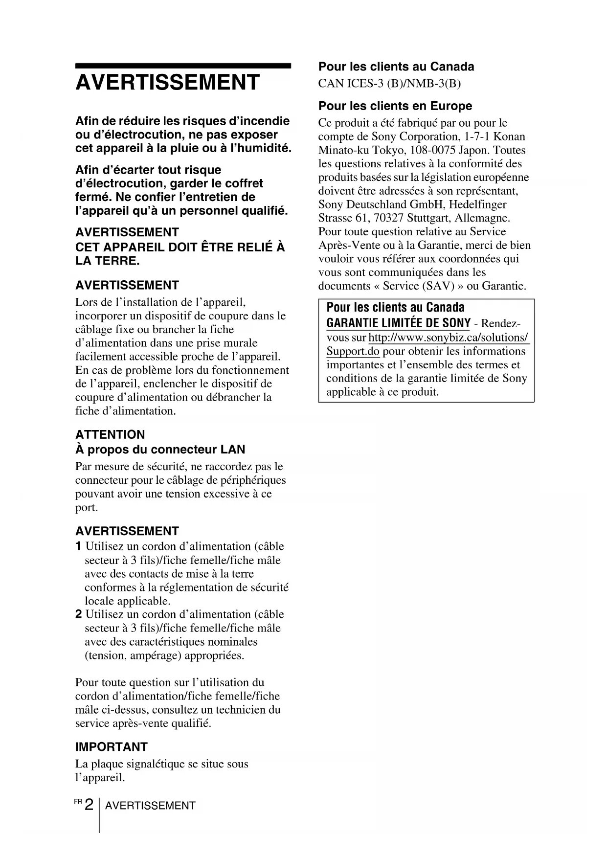 LA TERRE. AVERTISSEMENT Lors de l’installation de l’appareil, incorporer un dispositif de coupure dans le câblage fixe ou brancher la fiche d’alimentation dans une prise murale facilement accessible proche de l’appareil. En cas de problème lors du fonctionnement de l’appareil, enclencher le dispositif de coupure d’alimentation ou débrancher la fiche d’alimentation. ATTENTION À propos du connecteur LAN Par mesure de sécurité, ne raccordez pas le connecteur pour le câblage de périphériques pouvant avoir une tension excessive à ce port. AVERTISSEMENT 1 Utilisez un cordon d’alimentation (câble secteur à 3 fils)/fiche femelle/fiche mâle avec des contacts de mise à la terre conformes à la réglementation de sécurité locale applicable. 2 Utilisez un cordon d’alimentation (câble secteur à 3 fils)/fiche femelle/fiche mâle avec des caractéristiques nominales (tension, ampérage) appropriées. Pour toute question sur l’utilisation du cordon d’alimentation/fiche femelle/fiche mâle ci-dessus, consultez un technicien du service après-vente qualifié. IMPORTANT La plaque signalétique se situe sous l’appareil. Pour les clients au Canada CAN ICES-3 (B)/NMB-3(B) Pour les clients en Europe Ce produit a été fabriqué par ou pour le compte de Sony Corporation, 1-7-1 Konan Minato-ku Tokyo, 108-0075 Japon. Toutes les questions relatives à la conformité des produits basées sur la législation européenne doivent être adressées à son représentant, Sony Deutschland GmbH, Hedelfinger Strasse 61, 70327 Stuttgart, Allemagne. Pour toute question relative au Service Après-Vente ou à la Garantie, merci de bien vouloir vous référer aux coordonnées qui vous sont communiquées dans les documents « Service (SAV) » ou Garantie. Pour les clients au Canada GARANTIE LIMITÉE DE SONY - Rendez- vous sur http://www.sonybiz.ca/solutions/ Support.do pour obtenir les informations importantes et l’ensemble des termes et conditions de la garantie limitée de Sony applicable à ce produit.3