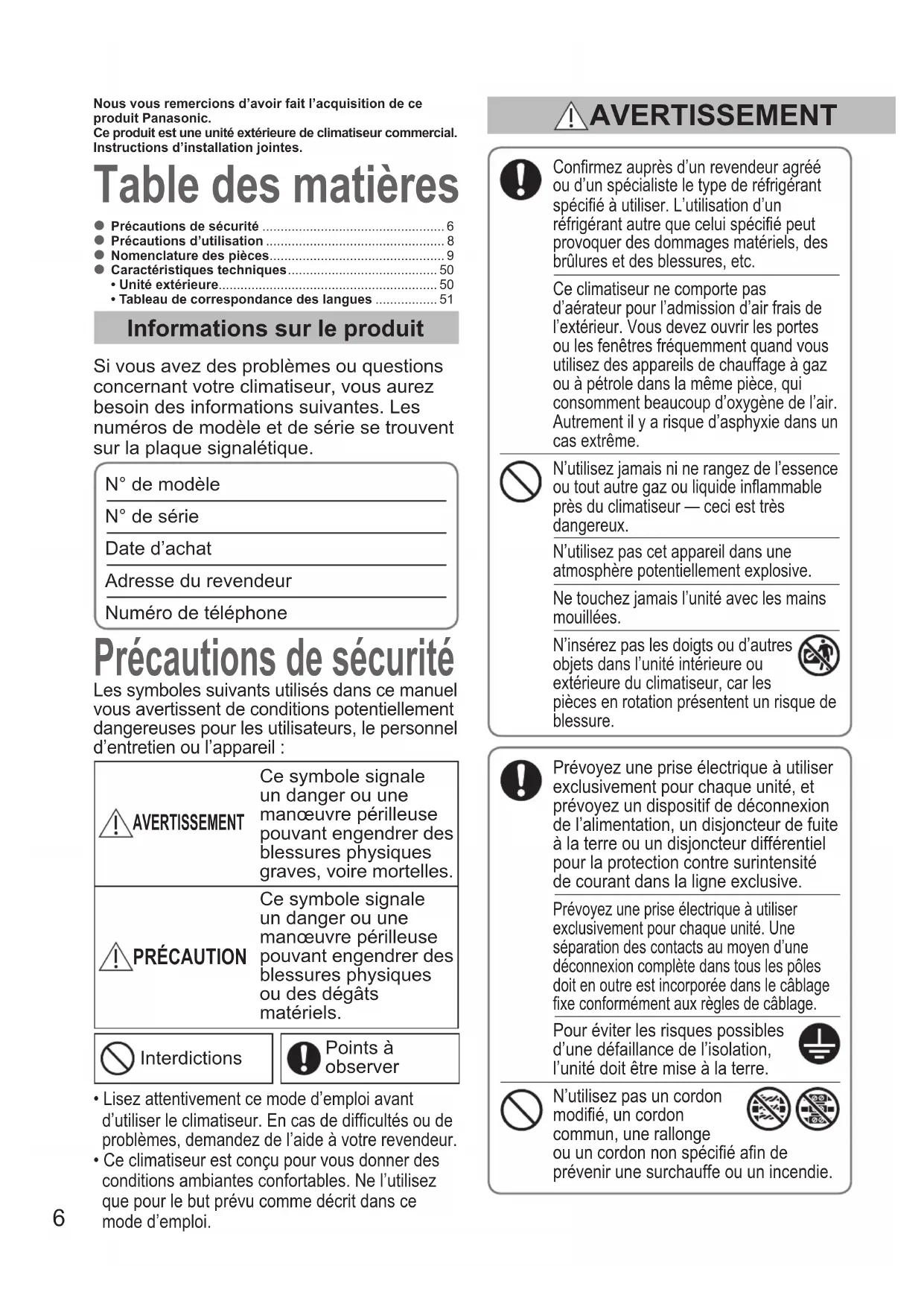 - Tableau de correspondance des langues ................. 51 Table des matières Précautions de sécurité Informations sur le produit Si vous avez des problèmes ou questions concernant votre climatiseur, vous aurez besoin des informations suivantes. Les numéros de modèle et de série se trouvent sur la plaque signalétique. N° de modèle N° de série Date d’achat Adresse du revendeur Numéro de téléphone Conrmez auprès d’un revendeur agréé ou d’un spécialiste le type de réfrigérant spécié à utiliser. L’utilisation d’un réfrigérant autre que celui spécié peut provoquer des dommages matériels, des brûlures et des blessures, etc. Ce climatiseur ne comporte pas d’aérateur pour l’admission d’air frais de l’extérieur. Vous devez ouvrir les portes ou les fenêtres fréquemment quand vous utilisez des appareils de chauffage à gaz ou à pétrole dans la même pièce, qui consomment beaucoup d’oxygène de l’air. Autrement il y a risque d’asphyxie dans un cas extrême. N’utilisez jamais ni ne rangez de l’essence ou tout autre gaz ou liquide inammable près du climatiseur — ceci est très dangereux. N’utilisez pas cet appareil dans une atmosphère potentiellement explosive. Ne touchez jamais l’unité avec les mains mouillées. N’insérez pas les doigts ou d’autres objets dans l’unité intérieure ou extérieure du climatiseur, car les pièces en rotation présentent un risque de blessure. Les symboles suivants utilisés dans ce manuel vous avertissent de conditions potentiellement dangereuses pour les utilisateurs, le personnel d’entretien ou l’appareil : AVERTISSEMENT Ce symbole signale un danger ou une manœuvre périlleuse pouvant engendrer des blessures physiques graves, voire mortelles. PRÉCAUTION Ce symbole signale un danger ou une manœuvre périlleuse pouvant engendrer des blessures physiques ou des dégâts matériels. Interdictions Points à observer Nous vous remercions d’avoir fait l’acquisition de ce produit Panasonic.Ce produit est une unité extérieure de climatiseur commercial.Instructions d’installation jointes.
