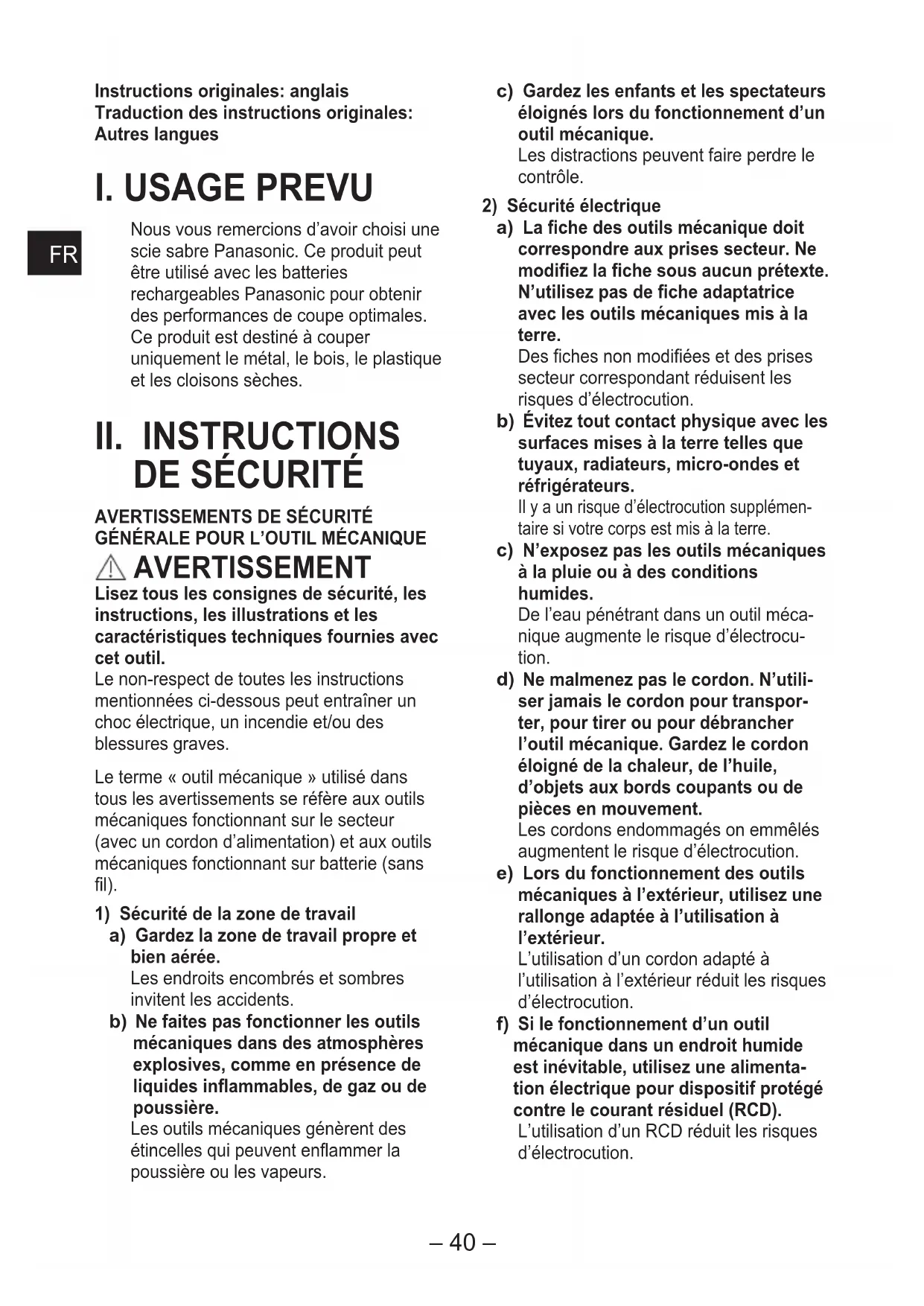 Nous vous remercions d’avoir choisi une scie sabre Panasonic. Ce produit peut être utilisé avec les batteries rechargeables Panasonic pour obtenir des performances de coupe optimales. Ce produit est destiné à couper uniquement le métal, le bois, le plastique et les cloisons sèches.