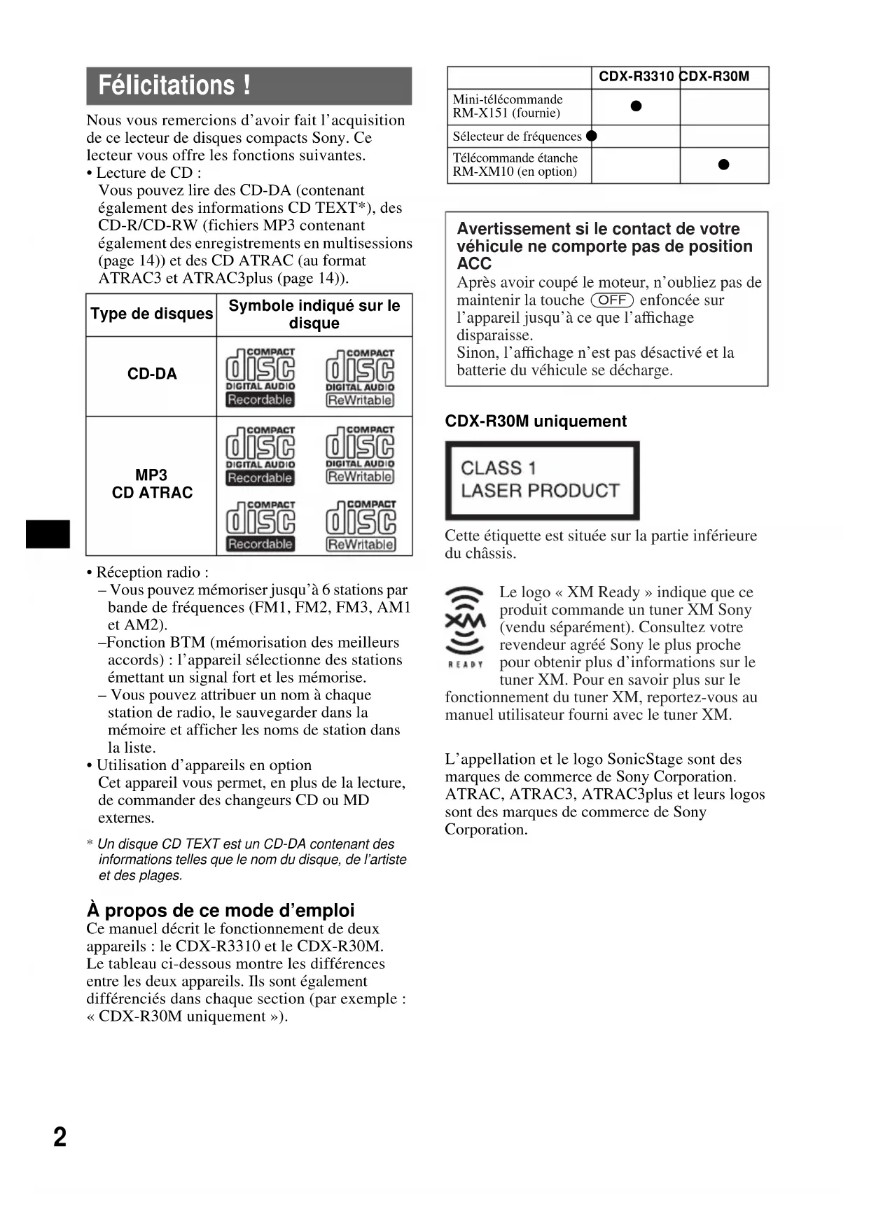 - Un disque CD TEXT est un CD-DA contenant des informations telles que le nom du disque, de l’artiste et des plages. À propos de ce mode d’emploi Ce manuel décrit le fonctionnement de deux appareils : le CDX-R3310 et le CDX-R30M. Le tableau ci-dessous montre les différences entre les deux appareils. Ils sont également différenciés dans chaque section (par exemple : « CDX-R30M uniquement »). CDX-R30M uniquement L’appellation et le logo SonicStage sont des marques de commerce de Sony Corporation. ATRAC, ATRAC3, ATRAC3plus et leurs logos sont des marques de commerce de Sony Corporation. Type de disquesSymbole indiqué sur le disqueCD-DA MP3 CD ATRACCDX-R3310 CDX-R30MMini-télécommande RM-X151 (fournie) Sélecteur de fréquences zTélécommande étanche RM-XM10 (en option)