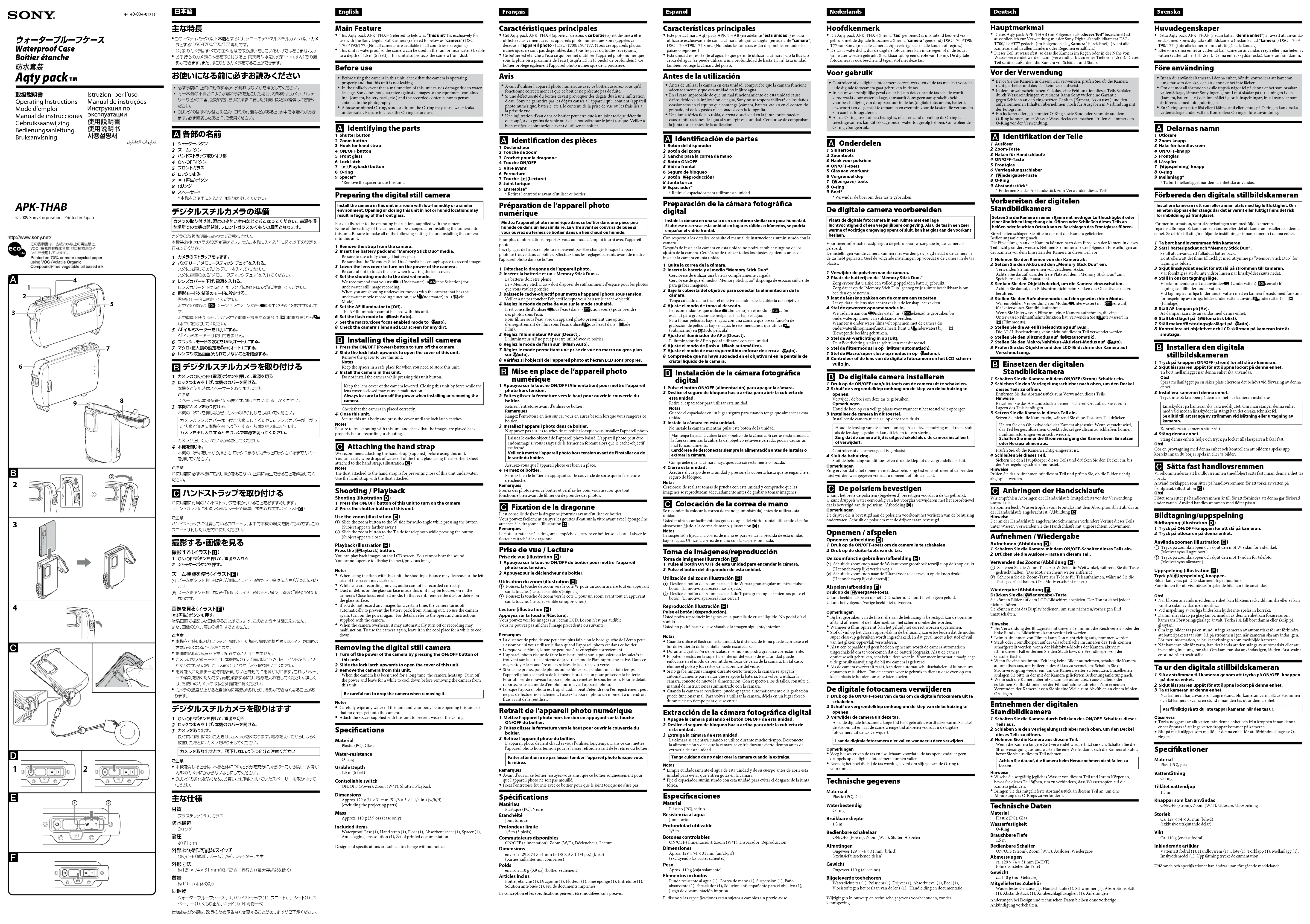 Français Caractéristiques principales Cet Aqty pack APK-THAB (appelé ci-dessous « ce boîtier ») est destiné à être utilisé exclusivement avec les appareils photo numériques Sony (appelés ci- dessous « l’appareil photo ») DSC-T700/T90/T77. (Tous ces appareils photos numériques ne sont pas disponibles dans tous les pays ou toutes les régions.)Ce boîtier est étanche à l’eau ce qui permet d’utiliser l’appareil photo numérique sous la pluie ou à proximité de l’eau (jusqu’à 1,5 m (5 pieds) de profondeur). Ce boîtier protège également l’appareil photo numérique de la poussière. Avis Avant d’utiliser l’appareil photo numérique avec ce boîtier, assurez-vous qu’il fonctionne correctement et que ce boîtier ne présente pas de fuite. Si une défectuosité du boîtier devait provoquer des dégâts dus à une inltration d’eau, Sony ne garantira pas les dégâts causés à l’appareil qu’il contient (appareil photo numérique, batterie, etc.), le contenu de la prise de vue ou les frais liés à la prise de vue. Une inltration d’eau dans ce boîtier peut être due à un joint torique détendu ou coupé, à des grains de sable ou à de la poussière sur le joint torique. Veillez à bien vérier le joint torique avant d’utiliser ce boîtier.
