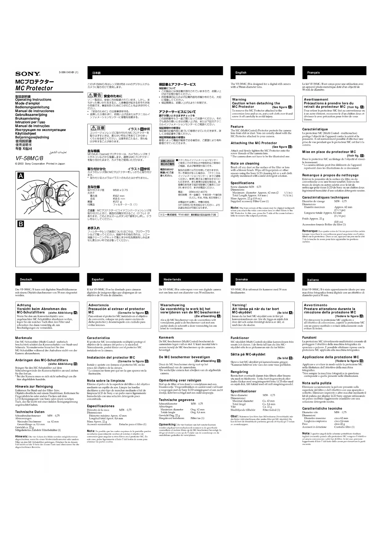 Le kit VF-58MC/B est conçu pour une utilisation avecun appareil photo numérique doté d’un objectif de58 mm de diamètre. Avertissement Précautions à prendre lors du retrait du protecteur MC (Voir fig. A)Pour retirer le protecteur MC fixé au convertisseur ouà un autre élément, recouvrez-le d’un chiffon doux etdévissez-le avec précaution pour éviter de vousblesser. Caractéristique Le protecteur MC (Multi Coated - multicouches)protège l’objectif de l’appareil contre la saleté et lapoussière. Il est normalement possible d’effectuer uneprise de vue pendant que le protecteur MC est fixé à lacaméra. Mise en place du protecteur MC (Voir fig. B)Fixez le protecteur MC au filetage de l’objectif et vissez-le fermement.* La caméra utilisée peut être différente de l’appareilreprésenté dans les illustrations de ce document. Remarque à propos du nettoyage Enlevez la poussière de la surface du filtre ou duconvertisseur avec une brosse-soufflet. Enlevez lestraces de doigts ou autres saletés avec le kit denettoyage pour écran LCD de Sony ou un chiffon douxlégèrement humidifié d’une solution détergente neutre. Caractéristiques techniques Diamètre de vissageM58 × 0,75DimensionsDiamètre maximumApprox. 62 mm