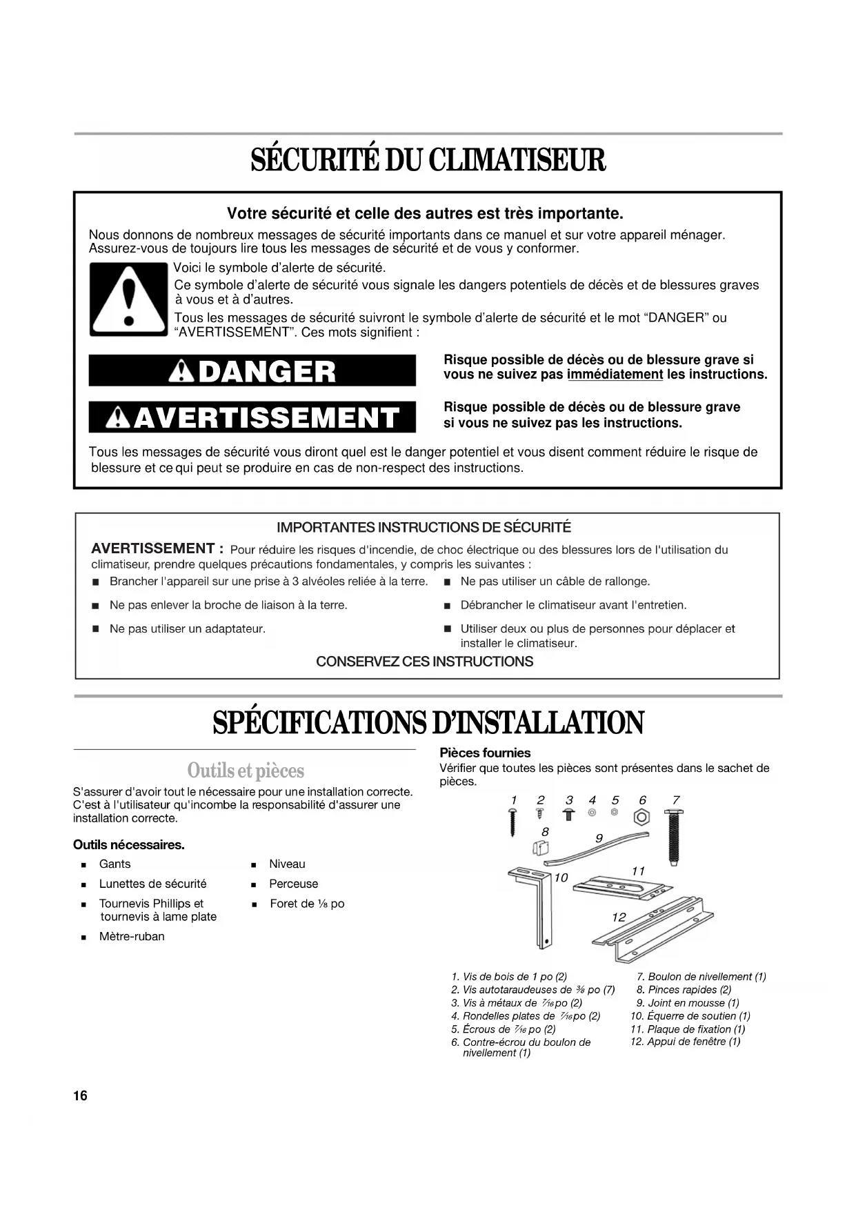 Outils et pièces S'assurer d'avoir tout le nécessaire pour une installation correcte. C'est à l'utilisateur qu'incombe la responsabilité d'assurer une installation correcte.Outils nécessaires.Pièces fournies Vérifier que toutes les pièces sont présentes dans le sachet de pièces.Risque possible de décès ou de blessure grave si Risque possible de décès ou de blessure grave si vous ne suivez pas les instructions. Tous les messages de sécurité vous diront quel est le danger potentiel et vous disent comment réduire le risque de qui peut se produire en cas de non-respect des instructions. Votre sécurité et celle des autres est très importante. Nous donnons de nombreux messages de sécurité importants dans ce manuel et sur votre appareil ménager. Ce symbole d’alerte de sécurité vous signale les dangers potentiels de décès et de blessures graves Tous les messages de sécurité suivront le symbole d’alerte de sécurité et le mot “DANGER” ou “AVERTISSEMENT”. Ces mots signifient : DANGER AVERTISSEMENT Assurez-vous de toujours lire tous les messages de sécurité et de vous y conformer. à vous et à d’autres.Voici le symbole d’alerte de sécurité.vous ne suivez pas immédiatement les instructions.blessure et ce IMPORTANTES INSTRUCTIONS DE SÉCURITÉAVERTISSEMENT : Pour réduire les risques d'incendie, de choc électrique ou des blessures lors de l'utilisation du climatiseur, prendre quelques précautions fondamentales, y compris les suivantes : CONSERVEZ CES INSTRUCTIONSDébrancher le climatiseur avant l'entretien.Utiliser deux ou plus de personnes pour déplacer et installer le climatiseur. Brancher l'appareil sur une prise à 3 alvéoles reliée à la terre. Ne pas enlever la broche de liaison à la terre.Ne pas utiliser un adaptateur.Ne pas utiliser un câble de rallonge. ■ Gants ■ Niveau ■ Lunettes de sécurité ■ Perceuse ■ Tournevis Phillips et tournevis à lame plate ■ Foret de ¹⁄₈ po ■ Mètre-ruban