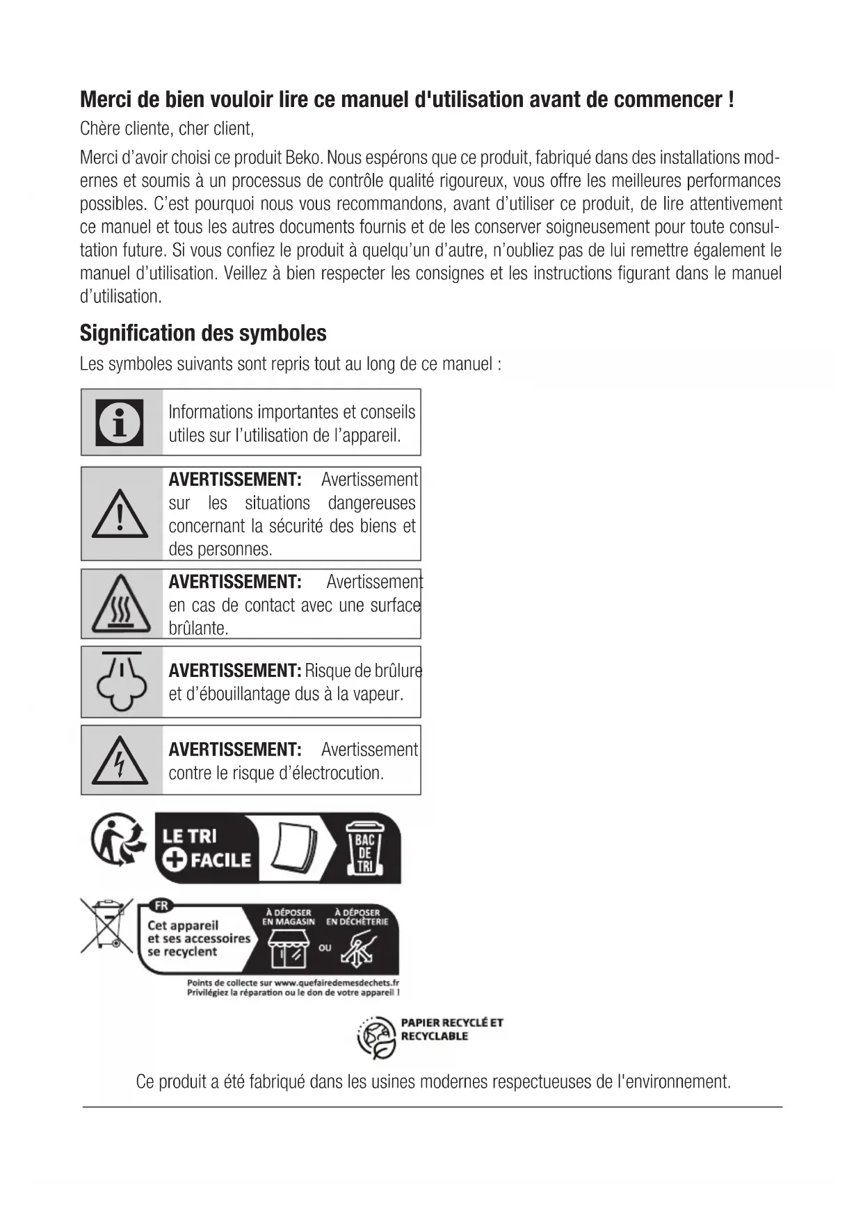 Diese Garantiezusage ist nur gültig innerhalb der Bundesrepublik Deutschland Garantiebedingungen - Beko – Version Februar 2021Merci de bien vouloir lire ce manuel d'utilisation avant de commencer ! Chère cliente, cher client, Merci d’avoir choisi ce produit Beko. Nous espérons que ce produit, fabriqué dans des installations mod- ernes et soumis à un processus de contrôle qualité rigoureux, vous offre les meilleures performances possibles. C’est pourquoi nous vous recommandons, avant d’utiliser ce produit, de lire attentivement ce manuel et tous les autres documents fournis et de les conserver soigneusement pour toute consul- tation future. Si vous confiez le produit à quelqu’un d’autre, n’oubliez pas de lui remettre également le manuel d’utilisation. Veillez à bien respecter les consignes et les instructions figurant dans le manuel d’utilisation. Signification des symboles Les symboles suivants sont repris tout au long de ce manuel :