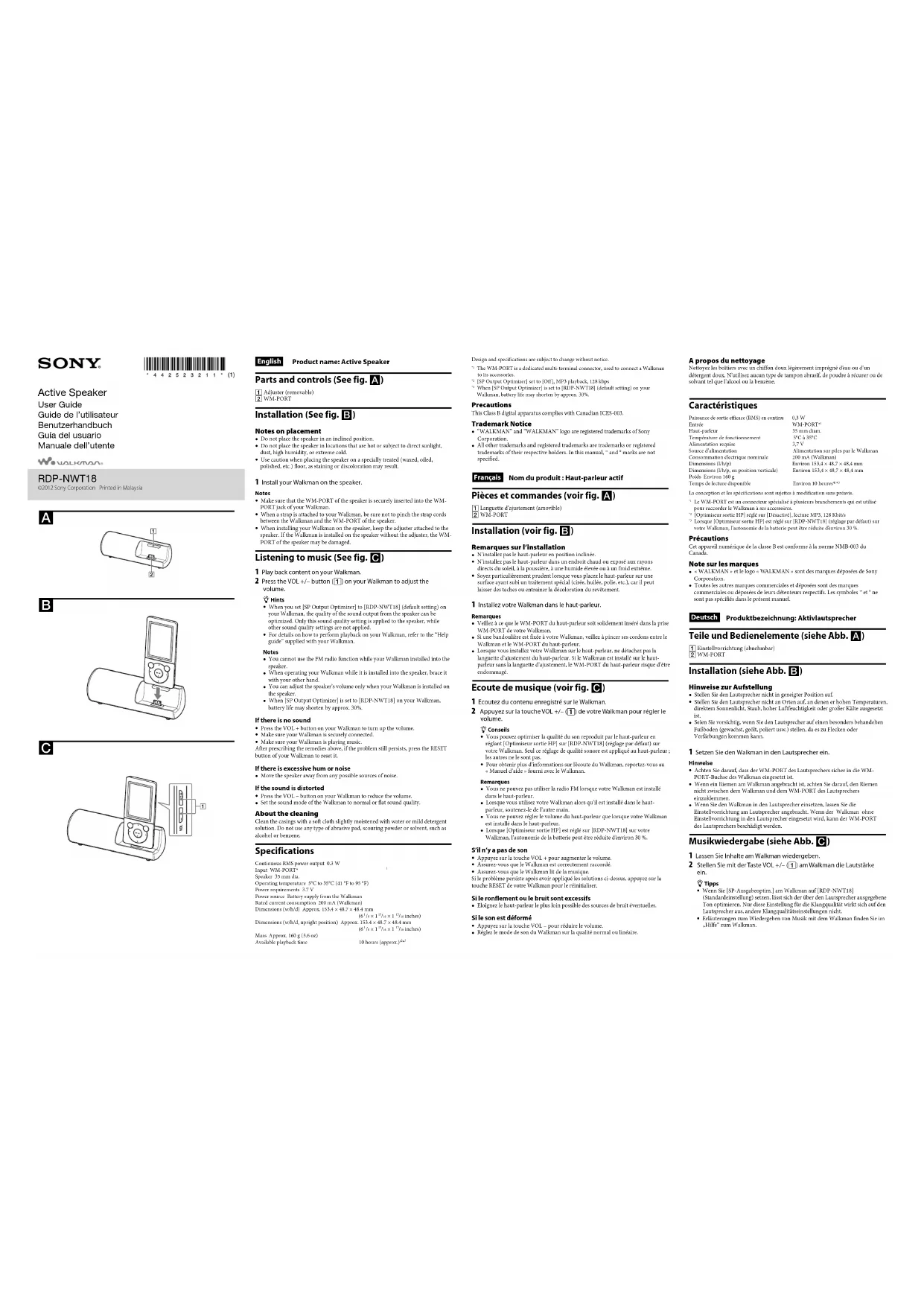 « WALKMAN » et le logo « WALKMAN » sont des marques déposées de Sony Corporation. Toutes les autres marques commerciales et déposées sont des marques commerciales ou déposées de leurs détenteurs respectifs. Les symboles ™ et ® ne sont pas spécifiés dans le présent manuel. Deutsch Produktbezeichnung: Aktivlautsprecher Teile und Bedienelemente (siehe Abb. ) Einstellvorrichtung (abnehmbar) WM-PORT Installation (siehe Abb. ) Hinweise zur Aufstellung