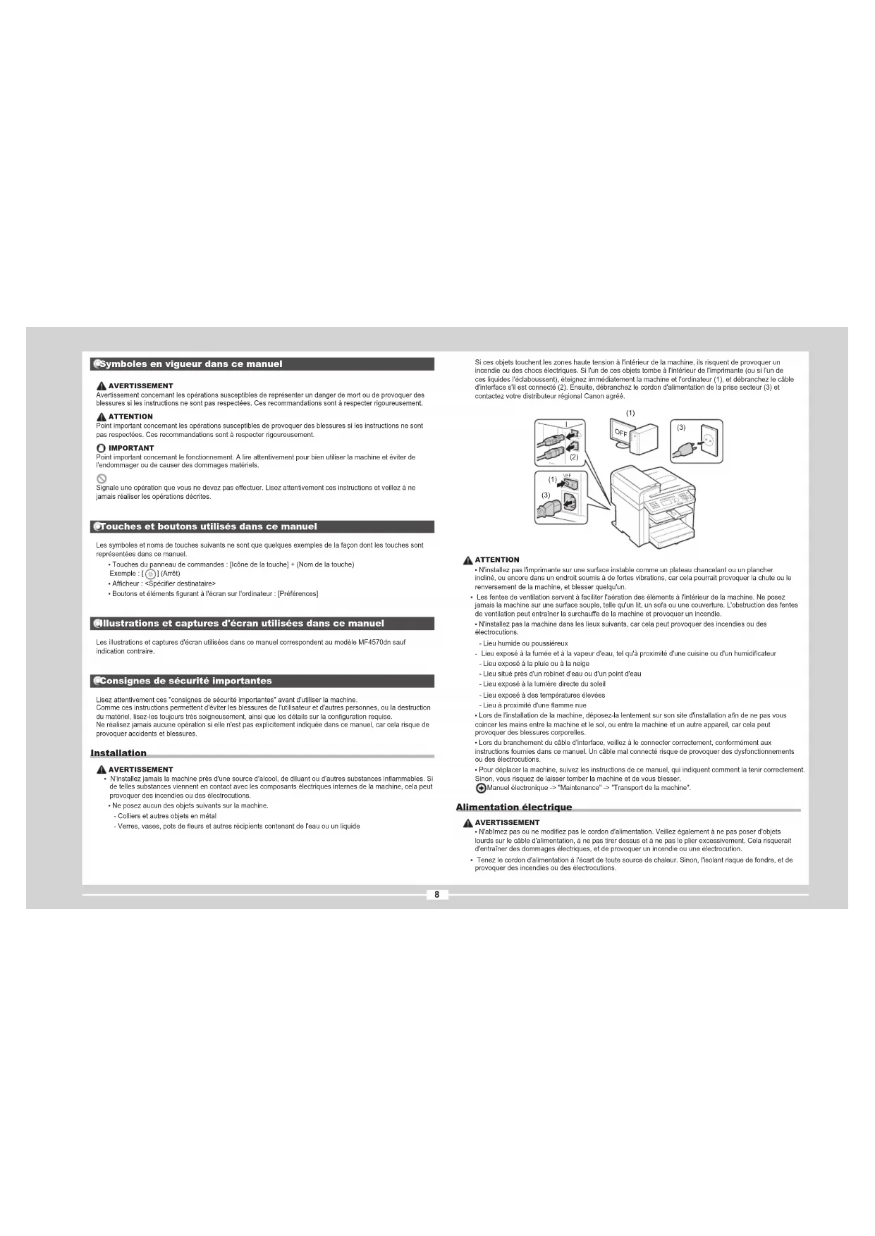 - Boutons et éléments gurant à l'écran sur l'ordinateur : [Préférences] Illustrations et captures d'écran utilisées dans ce manuel Les illustrations et captures d'écran utilisées dans ce manuel correspondent au modèle MF4570dn sauf indication contraire. Consignes de sécurité importantes Lisez attentivement ces "consignes de sécurité importantes" avant d'utiliser la machine. Comme ces instructions permettent d'éviter les blessures de l'utilisateur et d'autres personnes, ou la destruction du matériel, lisez-les toujours très soigneusement, ainsi que les détails sur la conguration requise. Ne réalisez jamais aucune opération si elle n'est pas explicitement indiquée dans ce manuel, car cela risque de provoquer accidents et blessures. Installation AVERTISSEMENT