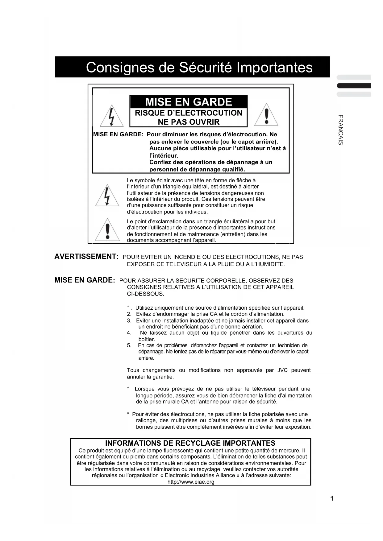 EXPOSER CE TELEVISEUR A LA PLUIE OU A L’HUMIDITE. MISE EN GARDE: POUR ASSURER LA SECURITE CORPORELLE, OBSERVEZ DES CONSIGNES RELATIVES A L’UTILISATION DE CET APPAREIL CI-DESSOUS. 1. Utilisez uniquement une source d’alimentation spécifiée sur l’appareil. 2. Evitez d’endommager la prise CA et le cordon d’alimentation. 3. Eviter une installation inadaptée et ne jamais installer cet appareil dans un endroit ne bénéficiant pas d'une bonne aération. 4. Ne laissez aucun objet ou liquide pénétrer dans les ouvertures du boîtier. 5. En cas de problèmes, débranchez l’appareil et contactez un technicien de dépannage. Ne tentez pas de le réparer par vous-même ou d’enlever le capot arrière. Tous changements ou modifications non approuvés par JVC peuvent annuler la garantie.