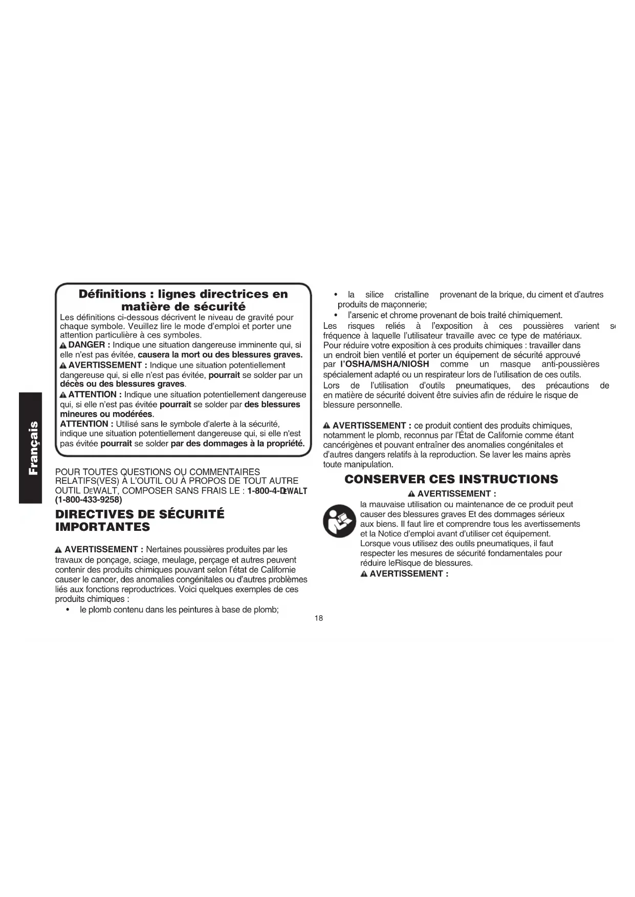 - l’arsenicetchromeprovenantdeboistraitéchimiquement. Les risques reliés à l’exposition à ces poussières varient selon la fréquence à laquelle l’utilisateur travaille avec ce type de matériaux. Pourréduirevotreexpositionàcesproduitschimiques:travaillerdans un endroit bien ventilé et porter un équipement de sécurité approuvé par l’OSHA/MSHA/NIOSH comme un masque anti-poussières spécialement adapté ou un respirateur lors de l’utilisation de ces outils. Lors de l’utilisation d’outils pneumatiques, des précautions de base enmatièredesécuritédoiventêtresuiviesafinderéduirelerisquede blessure personnelle.