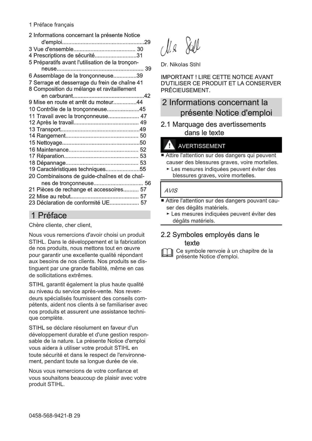 - 23 Déclaration de conformité UE 1 Préface Chère cliente, cher client, Nous vous remercions d'avoir choisi un produit STIHL. Dans le développement et la fabrication de nos produits, nous mettons tout en œuvre pour garantir une excellente qualité répondant aux besoins de nos clients. Nos produits se dis‐ tinguent par une grande fiabilité, même en cas de sollicitations extrêmes. STIHL garantit également la plus haute qualité au niveau du service après-vente. Nos reven‐ deurs spécialisés fournissent des conseils com‐ pétents, aident nos clients à se familiariser avec nos produits et assurent une assistance techni‐ que complète. STIHL se déclare résolument en faveur d'un développement durable et d'une gestion respon‐ sable de la nature. La présente Notice d'emploi vous aidera à utiliser votre produit STIHL en toute sécurité et dans le respect de l'environne‐ ment, pendant toute sa longue durée de vie. Nous vous remercions de votre confiance et vous souhaitons beaucoup de plaisir avec votre produit STIHL. Dr. Nikolas Stihl p. 57