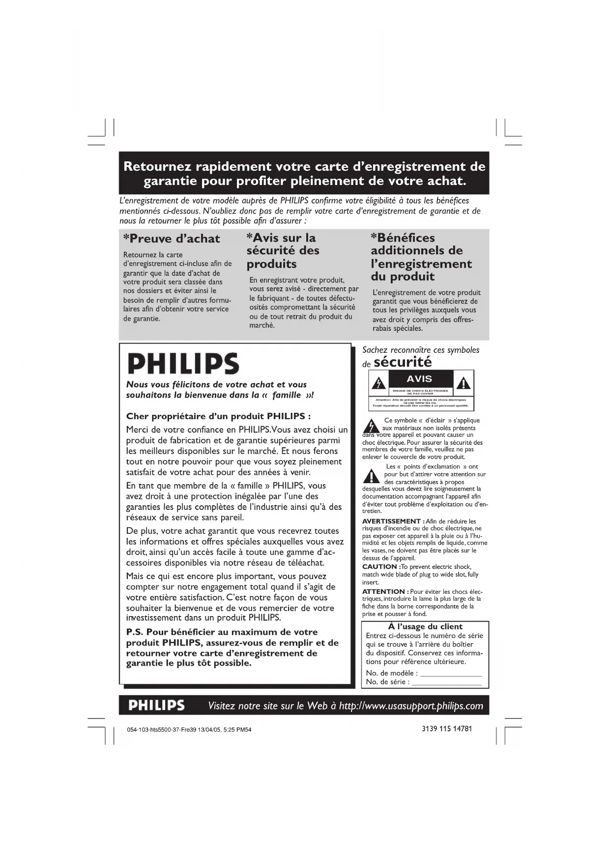 Attention: Afin de prévenir le risque de chocs électriques ne pas retirer les vis. Toute réparation devrait être confiée à un personnel qualifié. *Preuve d’achat *Avis sur la sécurité des produits *Bénéfices additionnels de l’enregistrement du produit Nous vous félicitons de votre achat et vous souhaitons la bienvenue dans la « famille »! Cher propriétaire d’un produit PHILIPS : Merci de votre confiance en PHILIPS.Vous avez choisi un produit de fabrication et de garantie supérieures parmi les meilleurs disponibles sur le marché. Et nous ferons tout en notre pouvoir pour que vous soyez pleinement satisfait de votre achat pour des années à venir. En tant que membre de la « famille » PHILIPS, vous avez droit à une protection inégalée par l’une des garanties les plus complètes de l’industrie ainsi qu’à des réseaux de service sans pareil. De plus, votre achat garantit que vous recevrez toutes les informations et offres spéciales auxquelles vous avez droit, ainsi qu’un accès facile à toute une gamme d’ac- cessoires disponibles via notre réseau de téléachat. Mais ce qui est encor e plus important, vous pouvez compter sur notr e engagement total quand il s’agit de