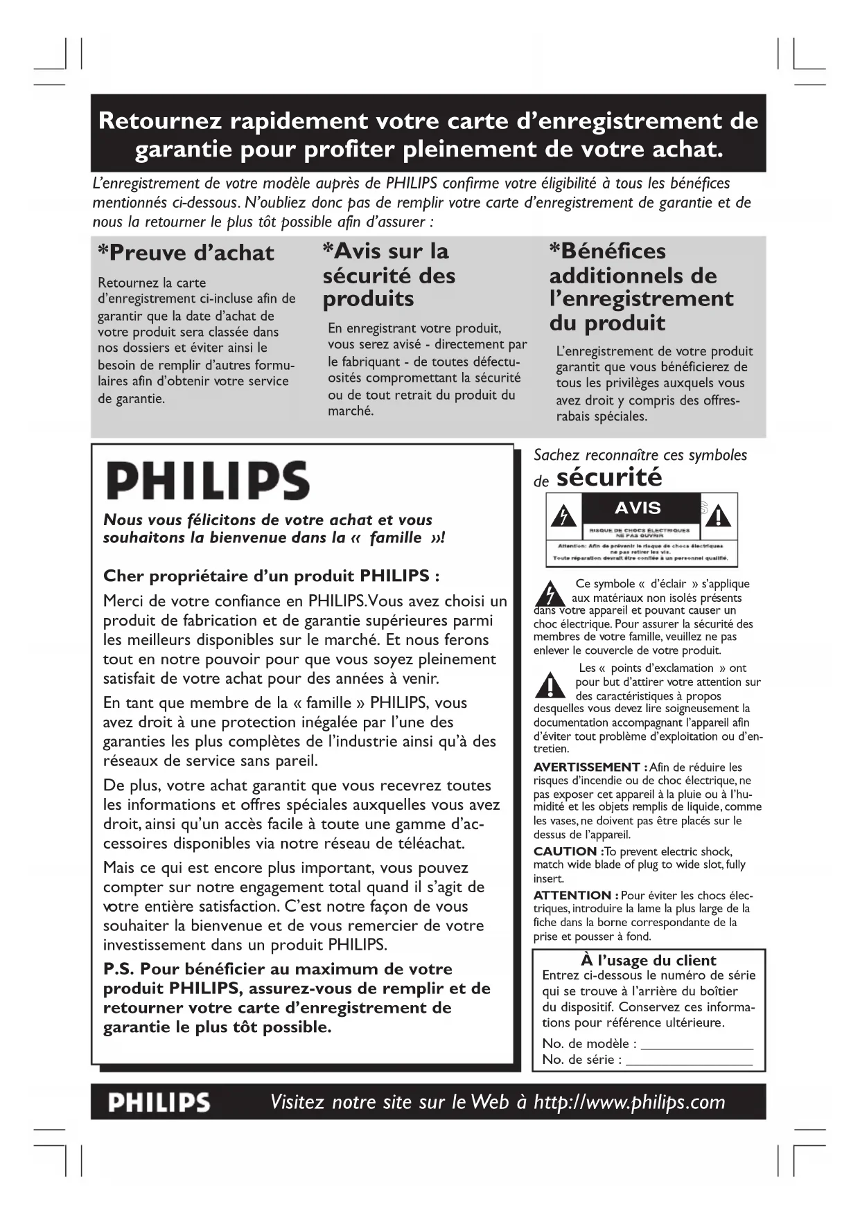 *Preuve d’achat *Avis sur la sécurité des produits *Bénéfices additionnels de l’enregistrement du produit Nous vous félicitons de votre achat et vous souhaitons la bienvenue dans la « famille »! Cher propriétaire d’un produit PHILIPS : Merci de votre confiance en PHILIPS.Vous avez choisi un produit de fabrication et de garantie supérieures parmi les meilleurs disponibles sur le marché. Et nous ferons tout en notre pouvoir pour que vous soyez pleinement satisfait de votre achat pour des années à venir. En tant que membre de la « famille » PHILIPS, vous avez droit à une protection inégalée par l’une des garanties les plus complètes de l’industrie ainsi qu’à des réseaux de service sans pareil. De plus, votre achat garantit que vous recevrez toutes les informations et offres spéciales auxquelles vous avez droit, ainsi qu’un accès facile à toute une gamme d’ac- cessoires disponibles via notre réseau de téléachat. Mais ce qui est encor e plus important, vous pouvez compter sur notr e engagement total quand il s’agit de