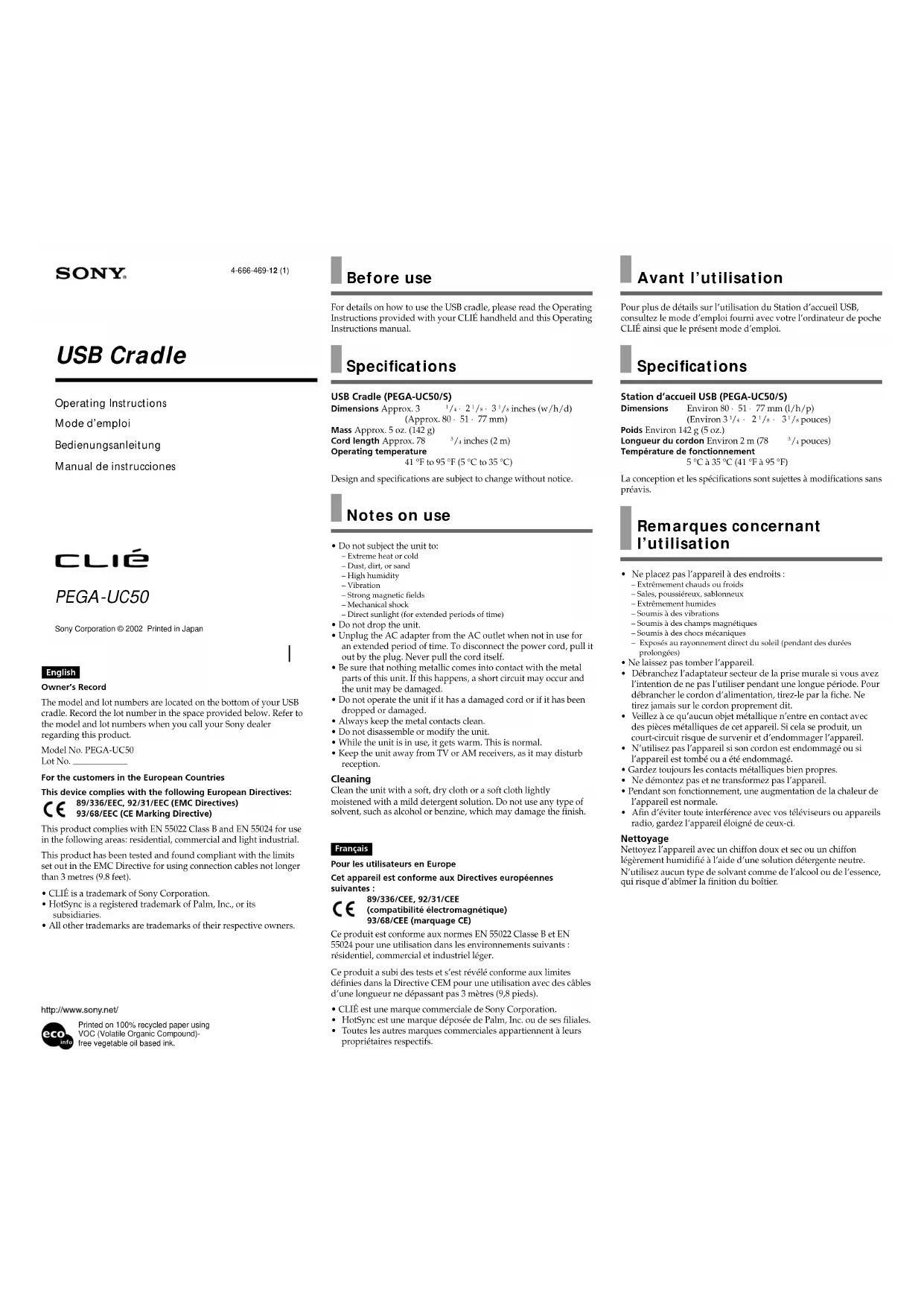 - Toutes les autres marques commerciales appartiennent à leurs propriétaires respectifs. Avant l’utilisation Pour plus de détails sur l’utilisation du Station d’accueil USB, consultez le mode d’emploi fourni avec votre l’ordinateur de poche CLIÉ ainsi que le présent mode d’emploi. Specifications Station d’accueil USB (PEGA-UC50/S) Dimensions Environ 80 × 51 × 77 mm (l/h/p) (Environ 3 /4 × 2 /8 × 3 /8 pouces)Poids Environ 142 g (5 oz.)Longueur du cordon Environ 2 m (78 /4 pouces)Température de fonctionnement 5 °C à 35 °C (41 °F à 95 °F) La conception et les spécifications sont sujettes à modifications sanspréavis. Remarques concernant l’utilisation