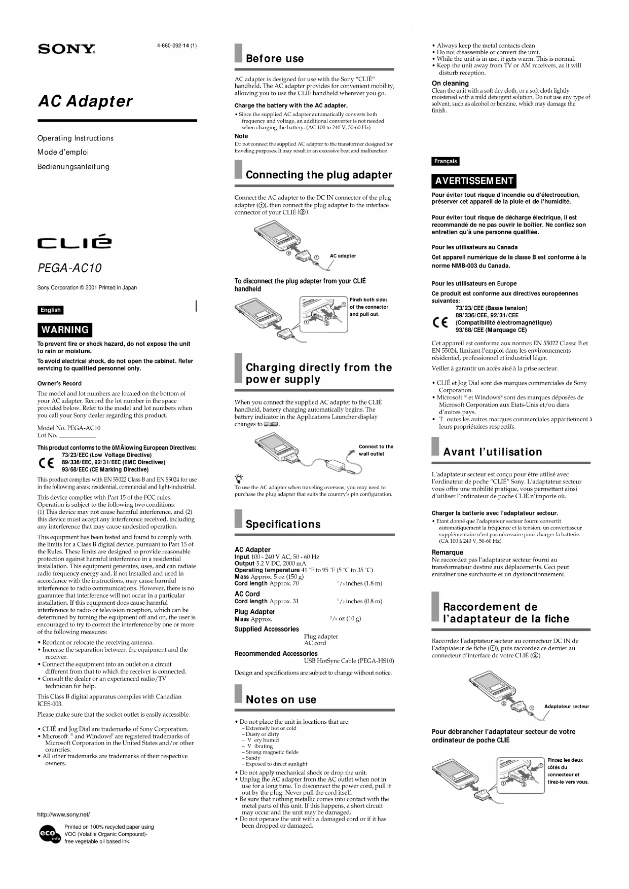 | Caractéristiques techniques | Modèle : SONY Clié PEGAAC10 |