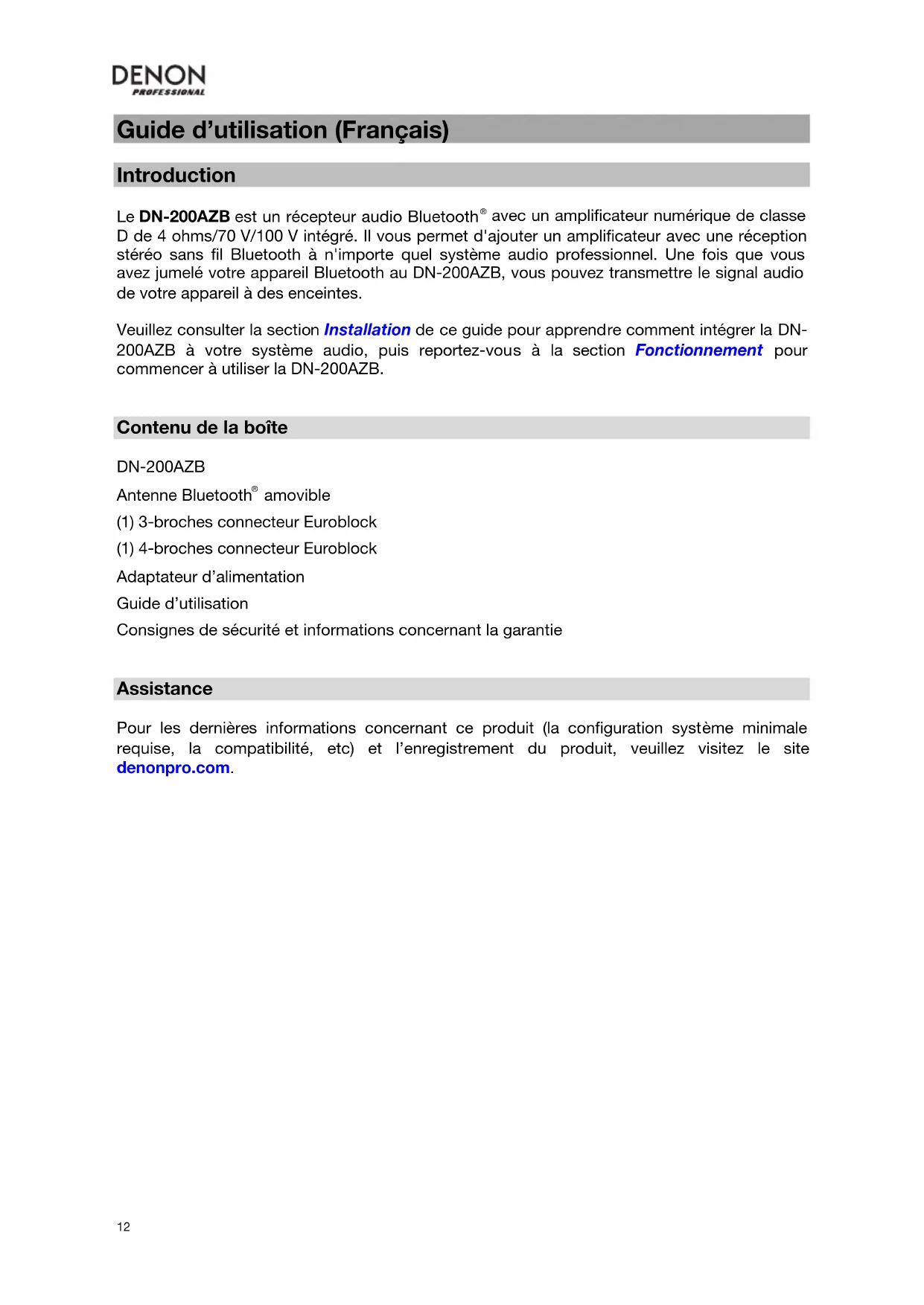 Assistance Pour les dernières informations concernant ce produit (la configuration système minimale requise, la compatibilité, etc) et l’enregistrement du produit, veuillez visitez le site denonpro.com.13