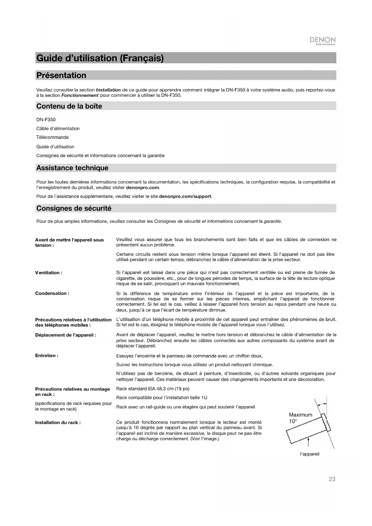 Contenu de la boîte DN-F350 Câble d'alimentation Télécommande Guide d'utilisation Consignes de sécurité et informations concernant la garantie Assistance technique Pour les toutes dernières informations concernant la documentation, les spécifications techniques, la configuration requise, la compatibilité et l’enregistrement du produit, veuillez visiter denonpro.com. Pour de l’assistance supplémentaire, veuillez visiter le site denonpro.com/support. Consignes de sécurité Pour de plus amples informations, veuillez consulter les Consignes de sécurité et informations concernant la garantie.