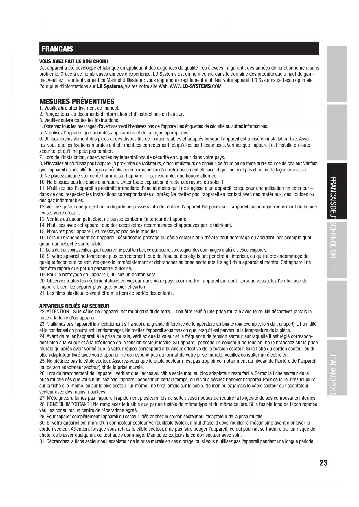 FRANCAIS VOUS AVEZ FAIT LE BON CHOIX! Cet appareil a été développé et fabriqué en appliquant des exigences de qualité très élevées : il garantit des années de fonctionnement sans problème. Grâce à de nombreuses années d‘expérience, LD Systems est un nom connu dans le domaine des produits audio haut de gam- me. Veuillez lire attentivement ce Manuel Utilisateur : vous apprendrez rapidement à utiliser votre appareil LD Systems de façon optimale. Pour plus d‘informations sur LD Systems, visitez notre site Web, WWW.LD-SYSTEMS.COM